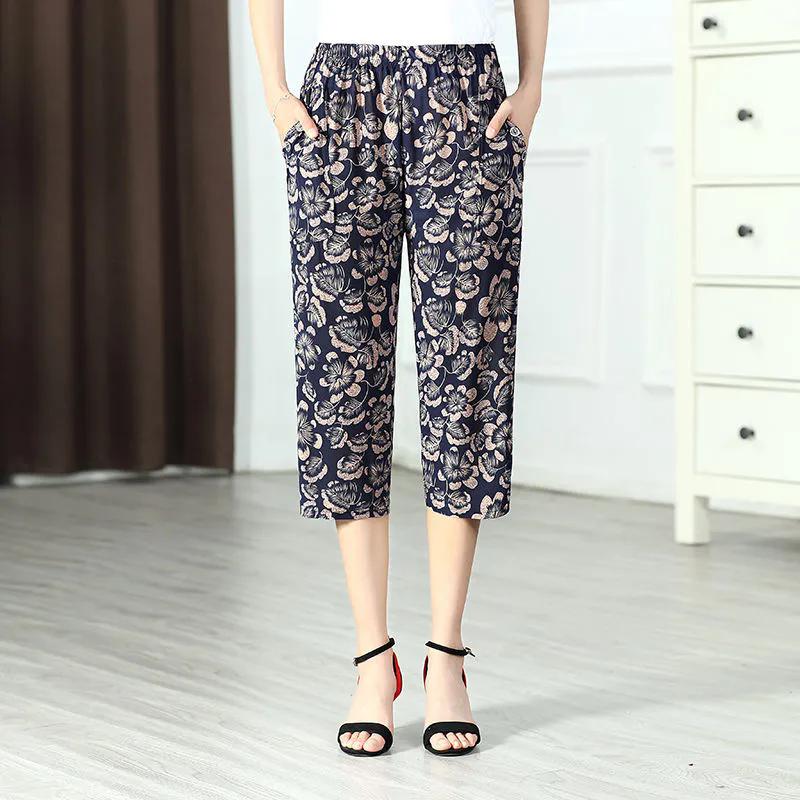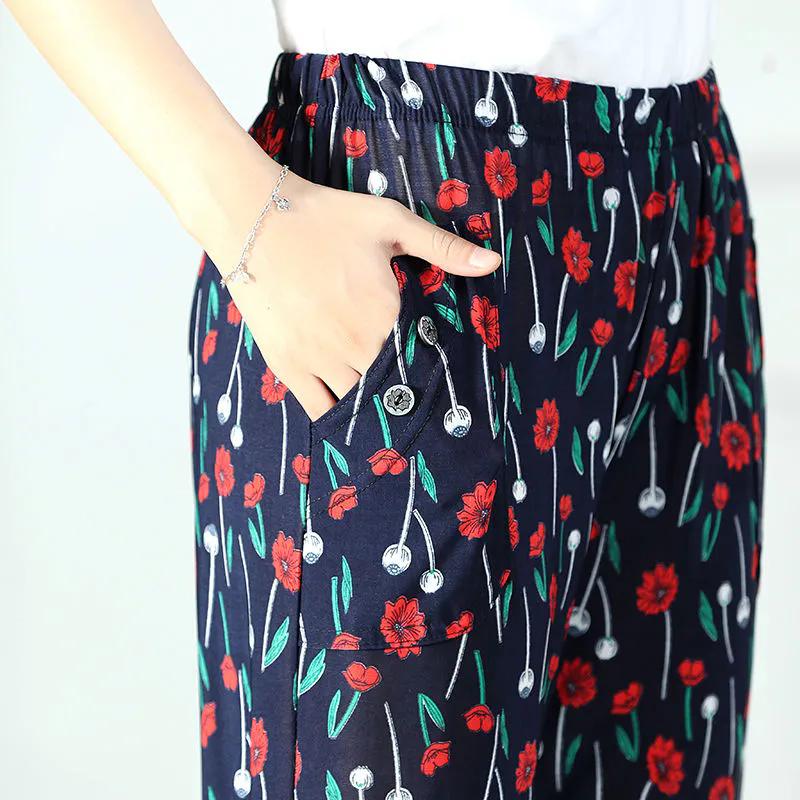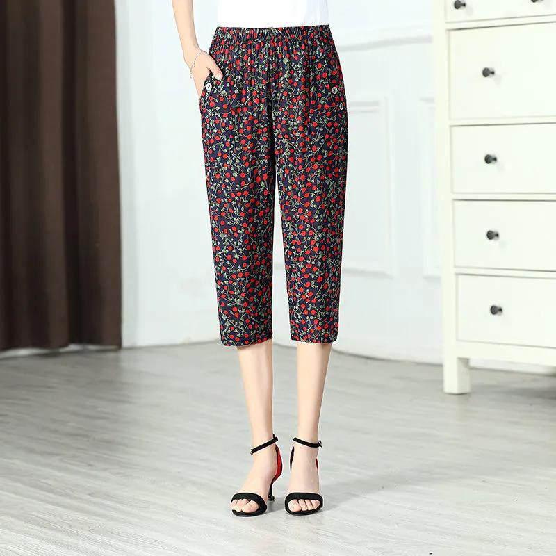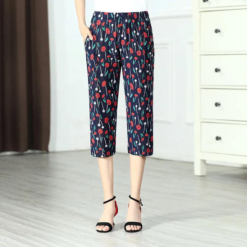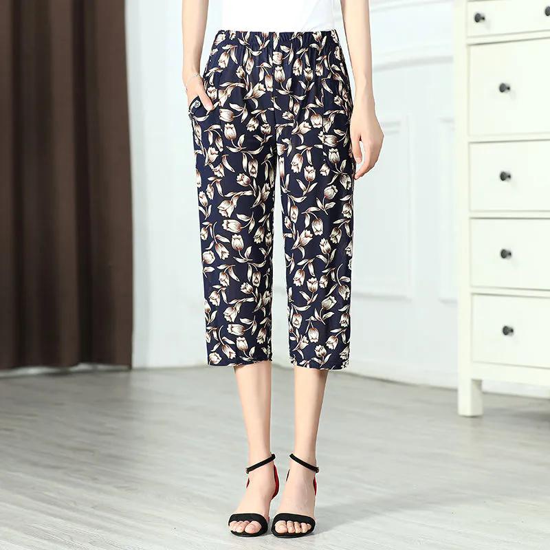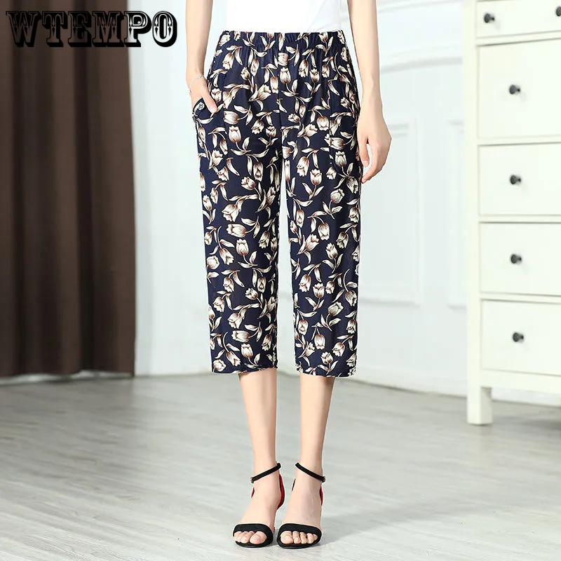 WTEMPO Женские весенне-летние средней длины эластичные с высокой талией тонкие принтованные брюки из ледяного шелка с широкими штанинами, свободные укороченные брюки для мамы