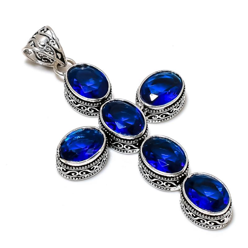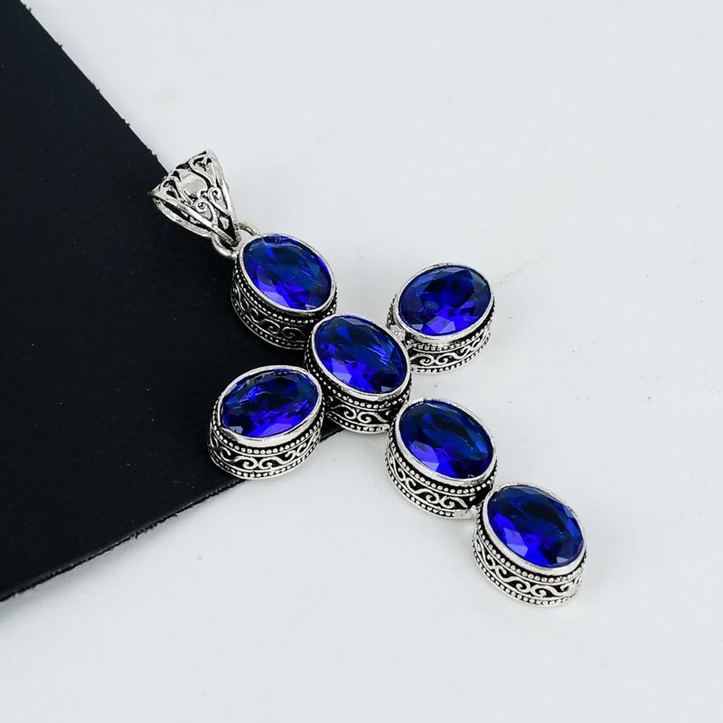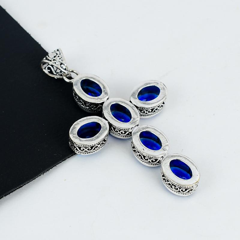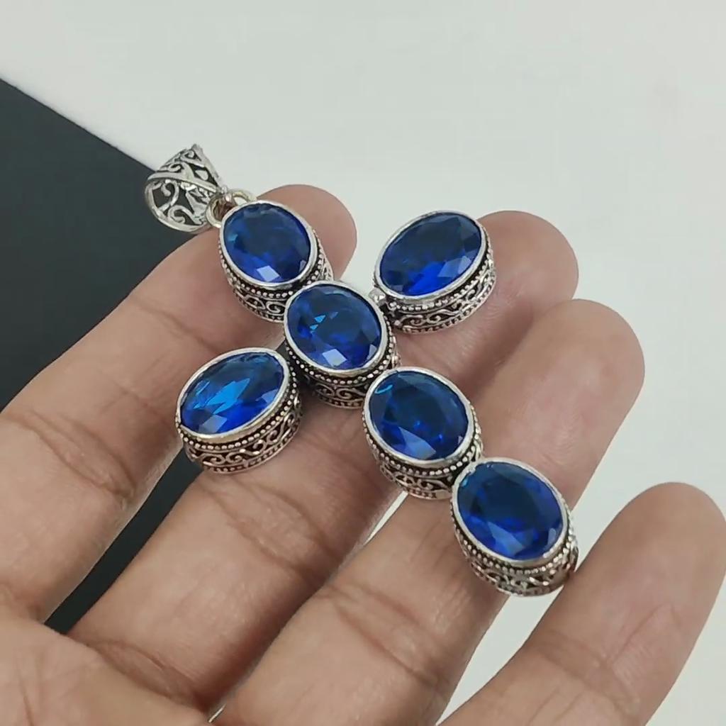 Подвеска с синим сапфиром, серебро 925 пробы - дизайн креста ручной работы, повседневные украшения, уникальные подарки с подвеской с синим сапфиром