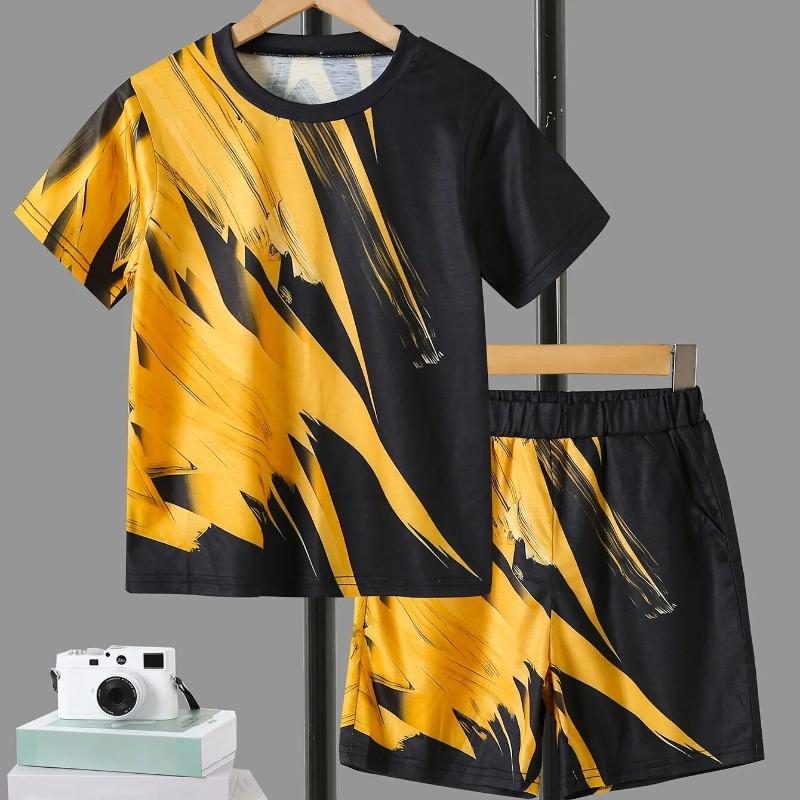 2 комплекта для мальчиков и подростков, летний желтый принт с масляной живописью, тонкая футболка с круглым вырезом и шорты с карманами, летний спортивный костюм
