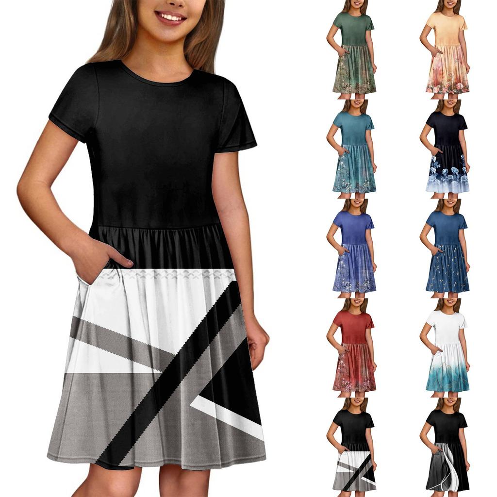 Летнее платье для девочек, однотонное платье без рукавов с принтом и карманом, повседневное платье, вечернее платье с короткими рукавами — купить товар онлайн с бесплатной доставкой до всему миру!
