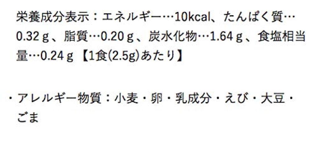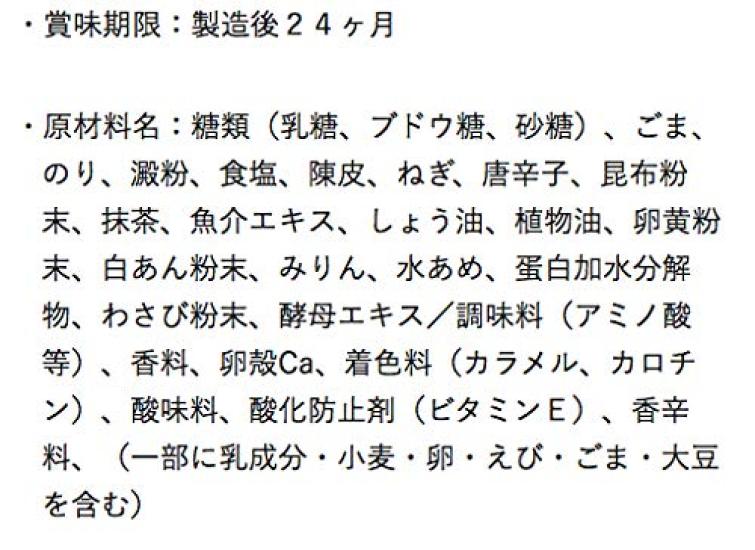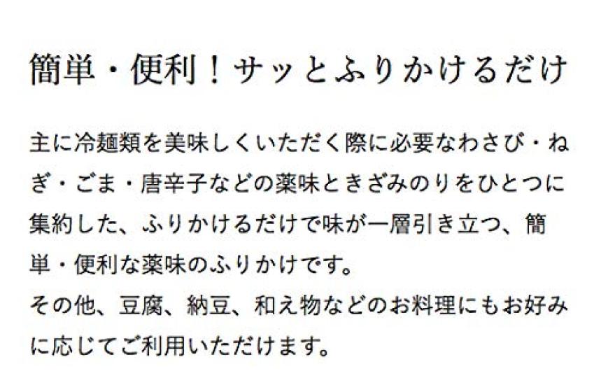 Содержит лилию, васаби, зеленый лук и перец чили.. Пожалуйста, используйте его в соответствии с вашими предпочтениями: от лапши, такой как соба и удон, до тофу и аэмоно.. Состав/Состав Сахарид, кунжут, морские водоросли, крахмал, соль, кожура, зеленый лук, перец чили, порошок из ламинарии, матча, экстракт морепродуктов, соевый соус, растительное масло, порошок яичного желтка, порошок белой фасоли, мирин, крахмальный сироп, гидролизат белка, порошок васаби, дрожжевой экстракт/приправа, ароматизатор, яичная скорлупа Ca, краситель, подкислитель, антиоксидант, специи