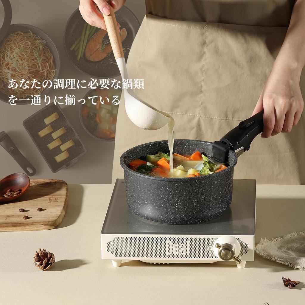 📏 [Содержимое набора/Материалы] Кастрюля 18 см/0,41 кг, кастрюля 20 см/0,41 кг, сковорода 20 см/0,38 кг, сковорода 26 см/0,59 кг, кастрюля для жарки 26 см/0,58 кг, сковорода для жарки яиц/0,39 кг, стеклянная крышка 26 см, крышка двойного назначения 16/18/20 см, специальная ручка x 2, герметичная крышка 18 см, герметичная крышка 20 см, вес упаковки (ок.): 4,89 кг