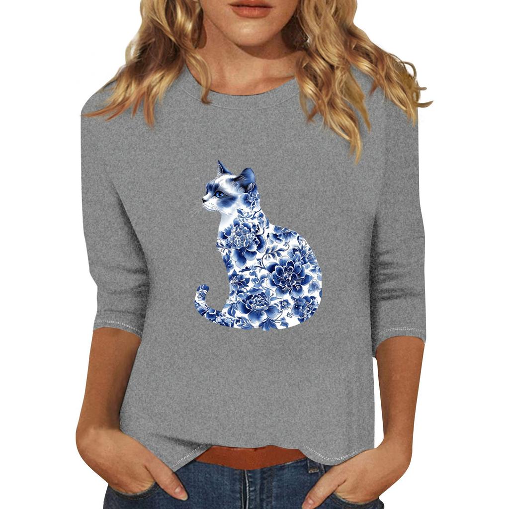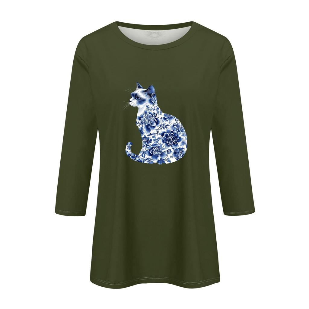 Женский модный повседневный свитер с круглым вырезом и рукавом три четверти с принтом фарфорового кота