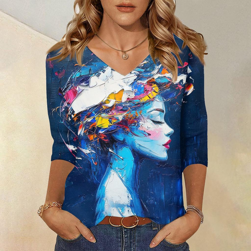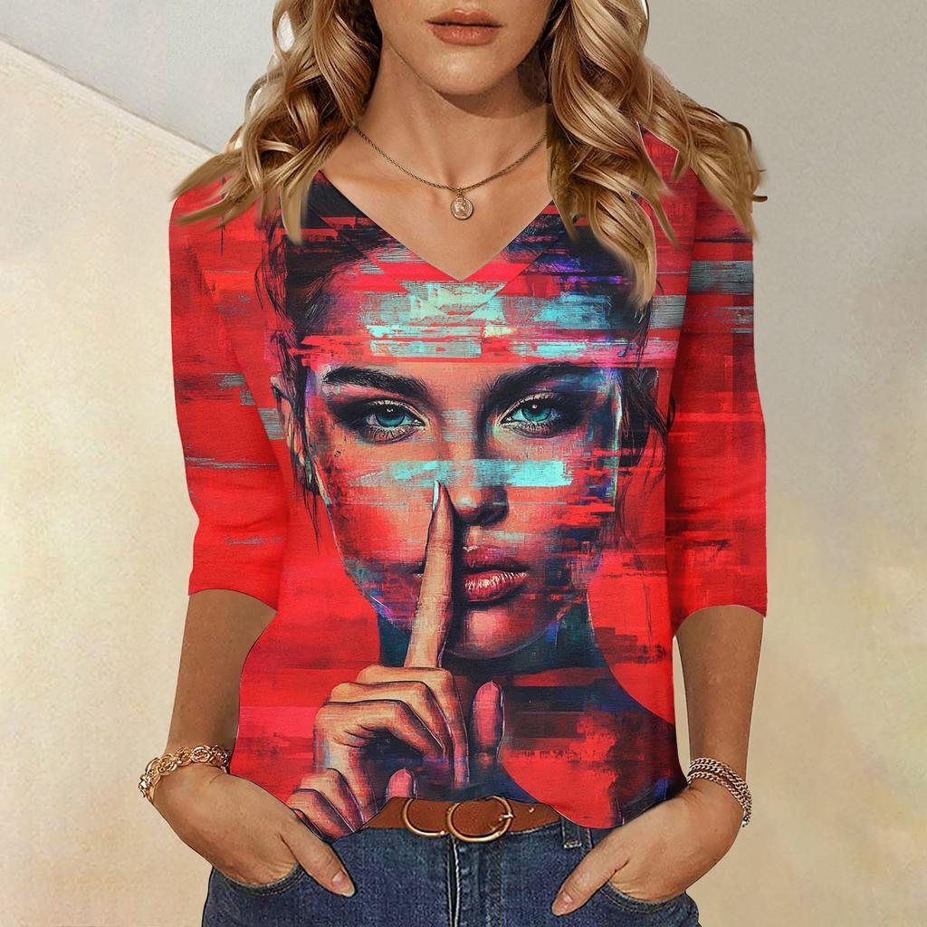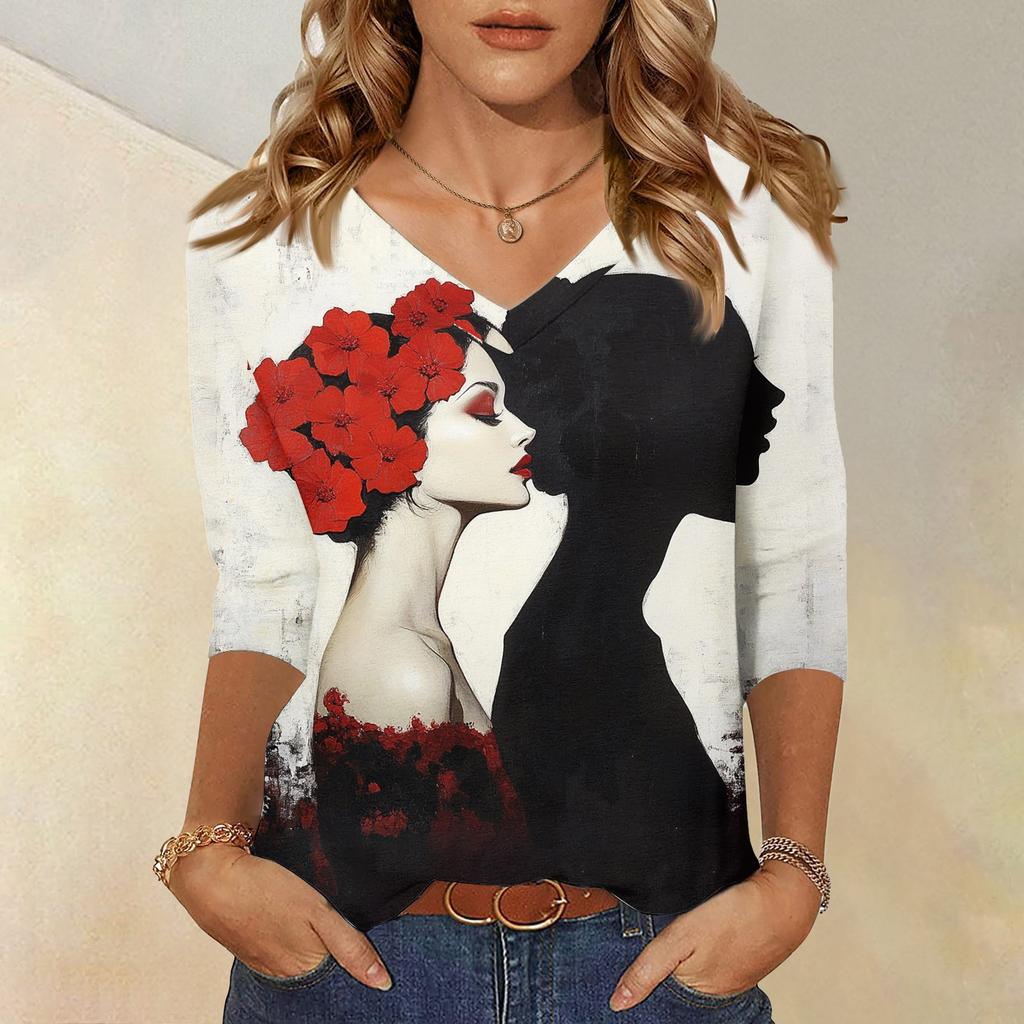 Женские топы, рубашка с рукавом три четверти, свободная повседневная рубашка с V-образным вырезом, футболка с принтом персонажей
