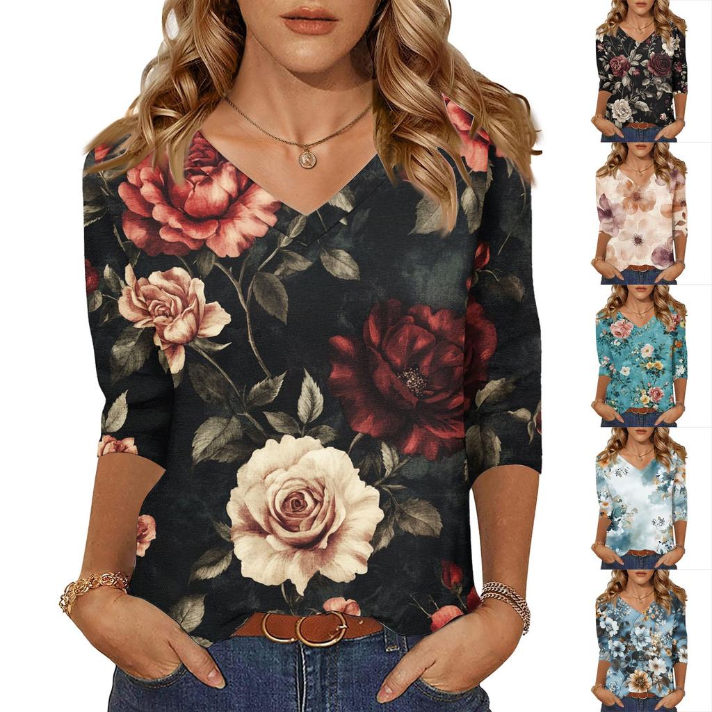Женские топы, рубашка с рукавом три четверти, свободная повседневная рубашка с V-образным вырезом, футболка с цветочным принтом — купить товар онлайн с бесплатной доставкой до всему миру!
