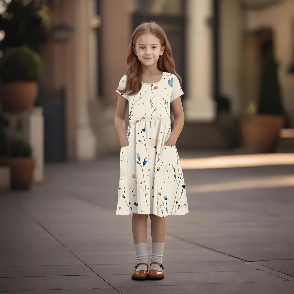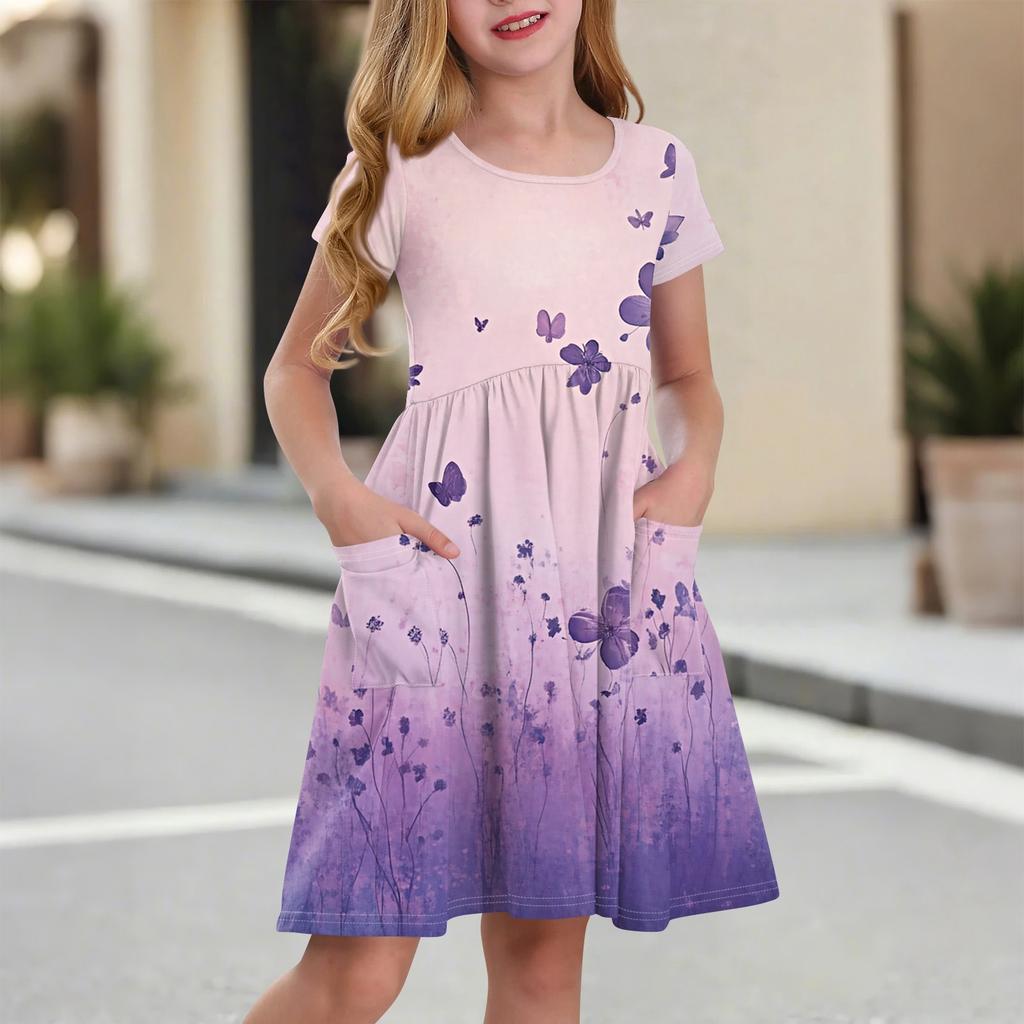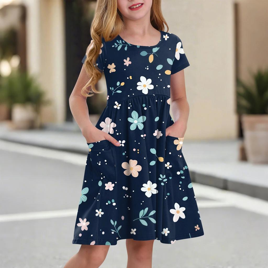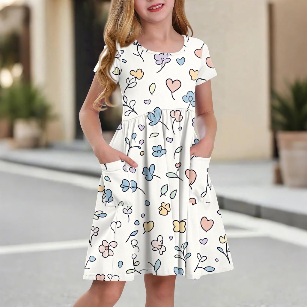 Детская юбка с круглым вырезом и коротким рукавом, платье принцессы, модное повседневное платье с карманами для девочек