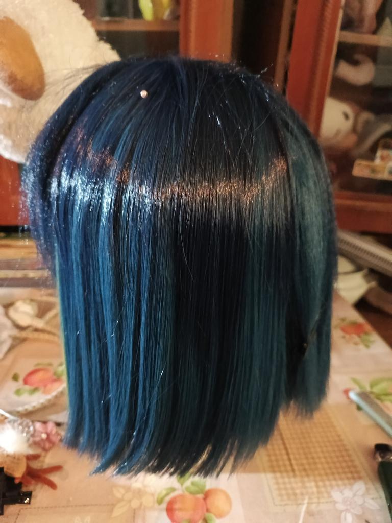 Парик чудесный! Очень густой, нет никаких проплешин, почти не осыпается, есть градиент цвета. На макушке имеется имитация кожи головы. Единственное, зелёные прядки несколько коряво сделаны (где-то в перемешку есть черные), но это исправимо. Для меня он довольно сложно поддавался гофрации, возможно плойка была не достаточно мощная. Однако, париком очень довольна и рекомендую к заказу 🙂↕️ У меня нет нормальной фотки парика до укладки, есть только такая Не судите строго, это моя первая укладка 🫡 (Челку потом переделаю)