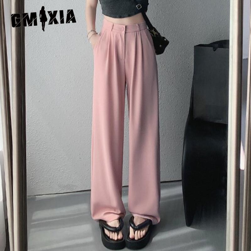 GMXIA Pink High Waist Draped Wide Leg Pants Women's Summer Suit Pants Straight Peplum Casual Women's Pants — купить товар онлайн с бесплатной доставкой по всему миру!