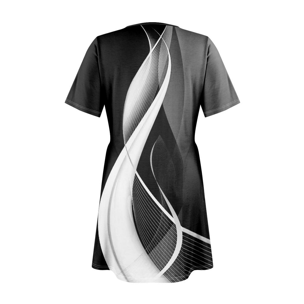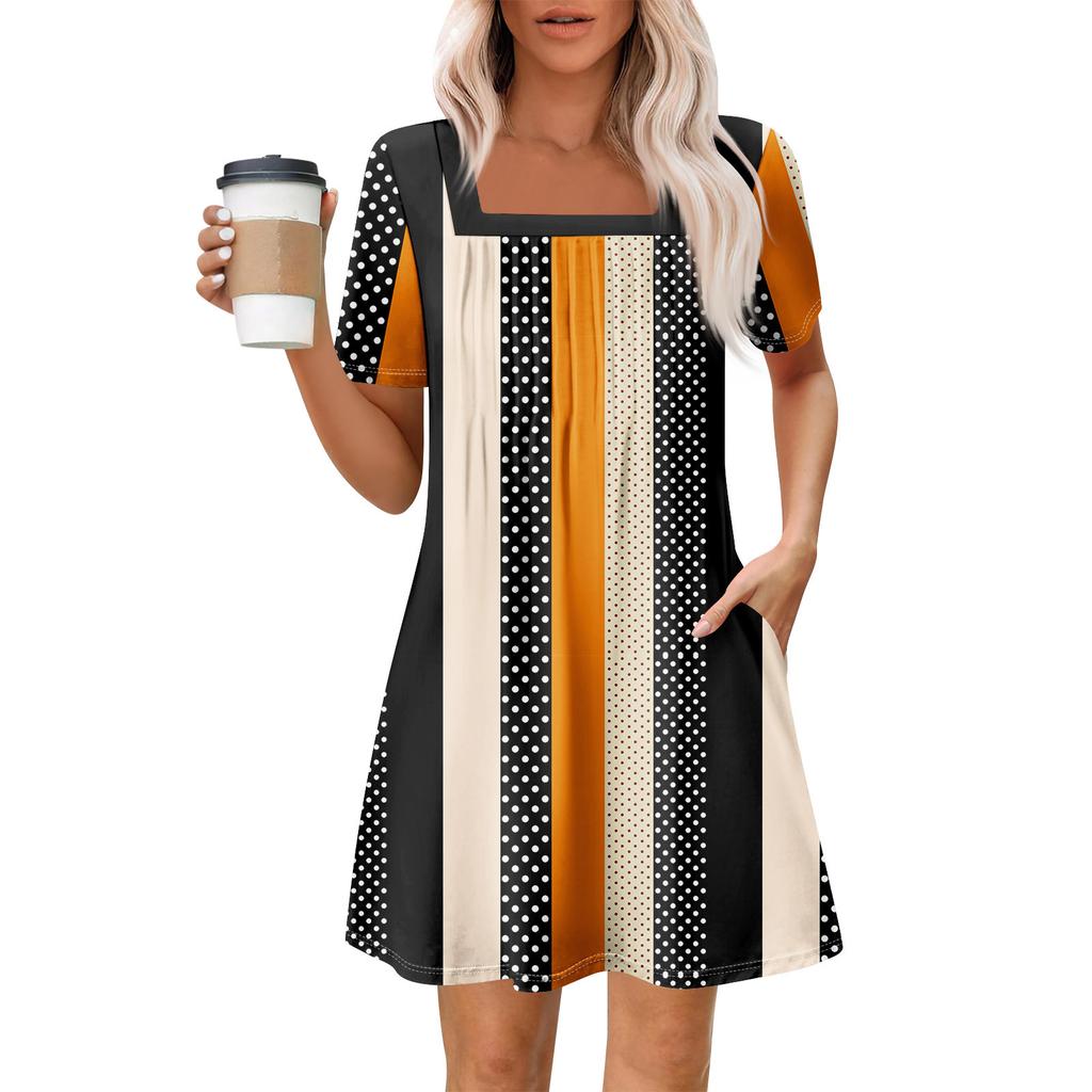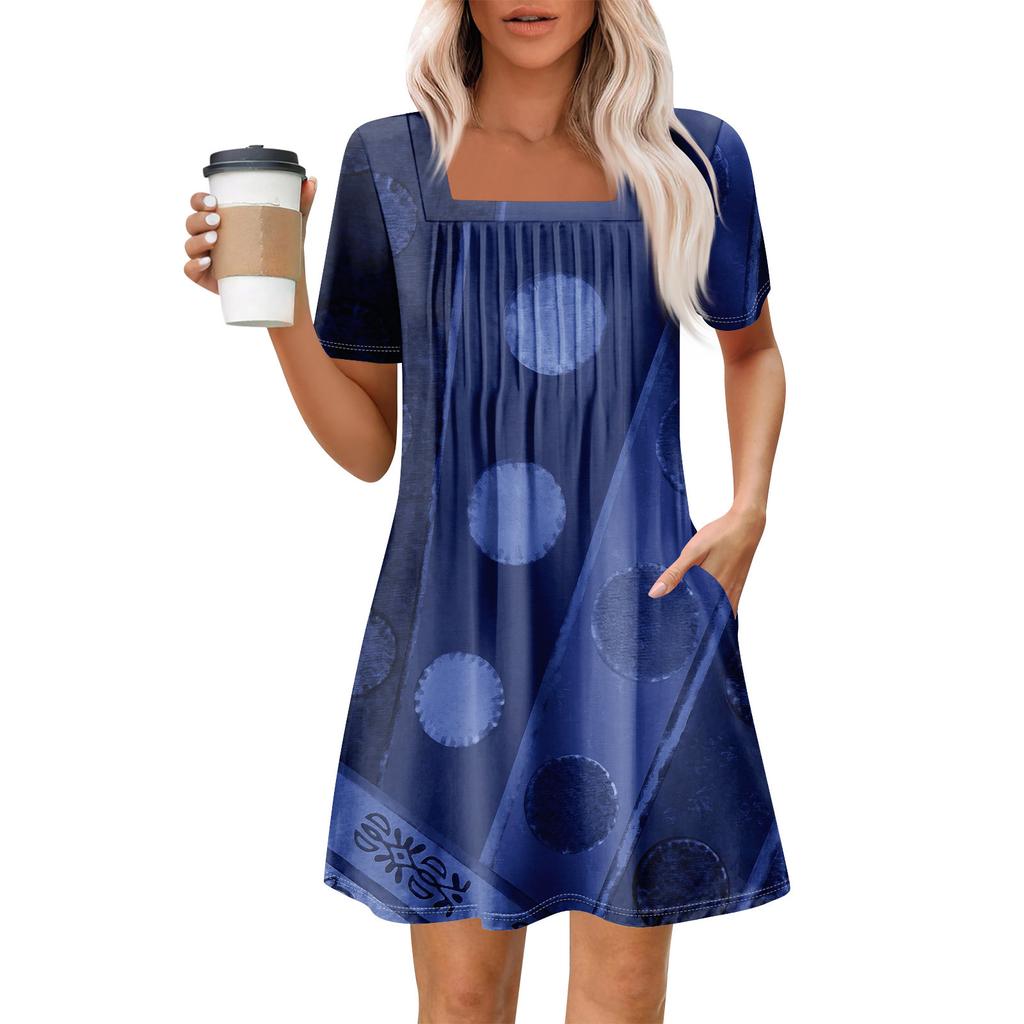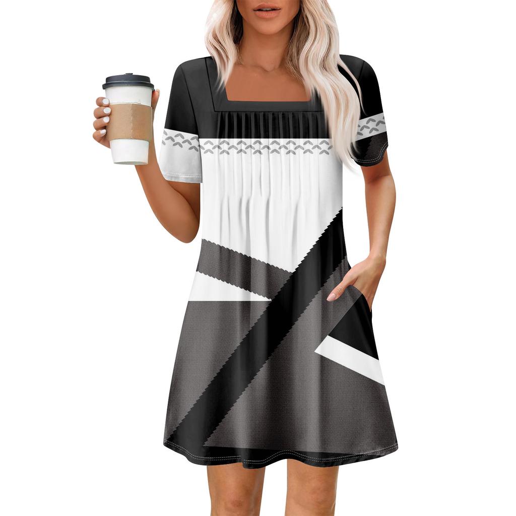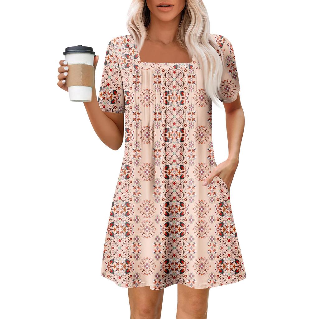 Женские летние повседневные платья с квадратным вырезом, плиссировкой спереди и карманом, с короткими рукавами и принтом