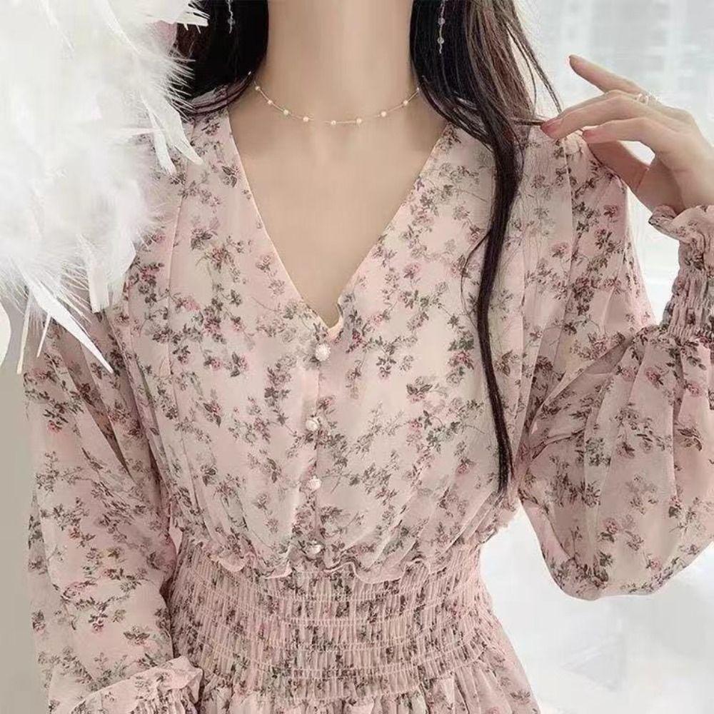 Aesthetic Flower Printing Dress Vintage V-neck Collar Dress Bohemian Chiffon Dress Formal Occasion