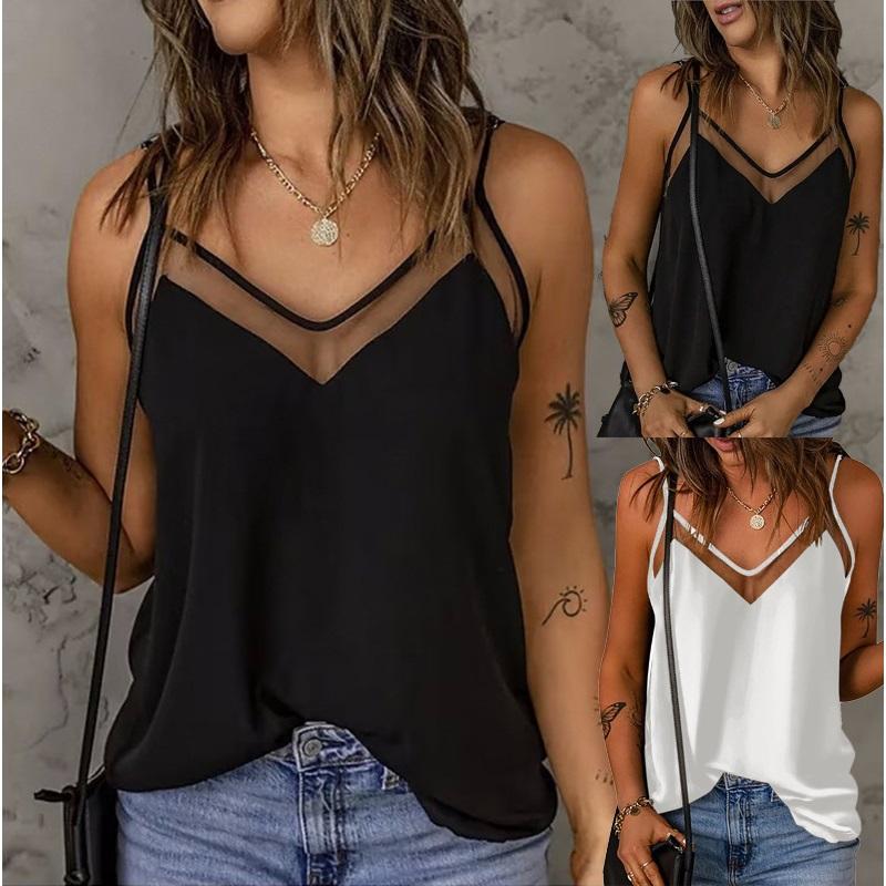 Однотонные бретельки-спагетти сетка V-образный вырез сращивание кофточка маленькая майка женская — купить товар онлайн с бесплатной доставкой по всему миру!