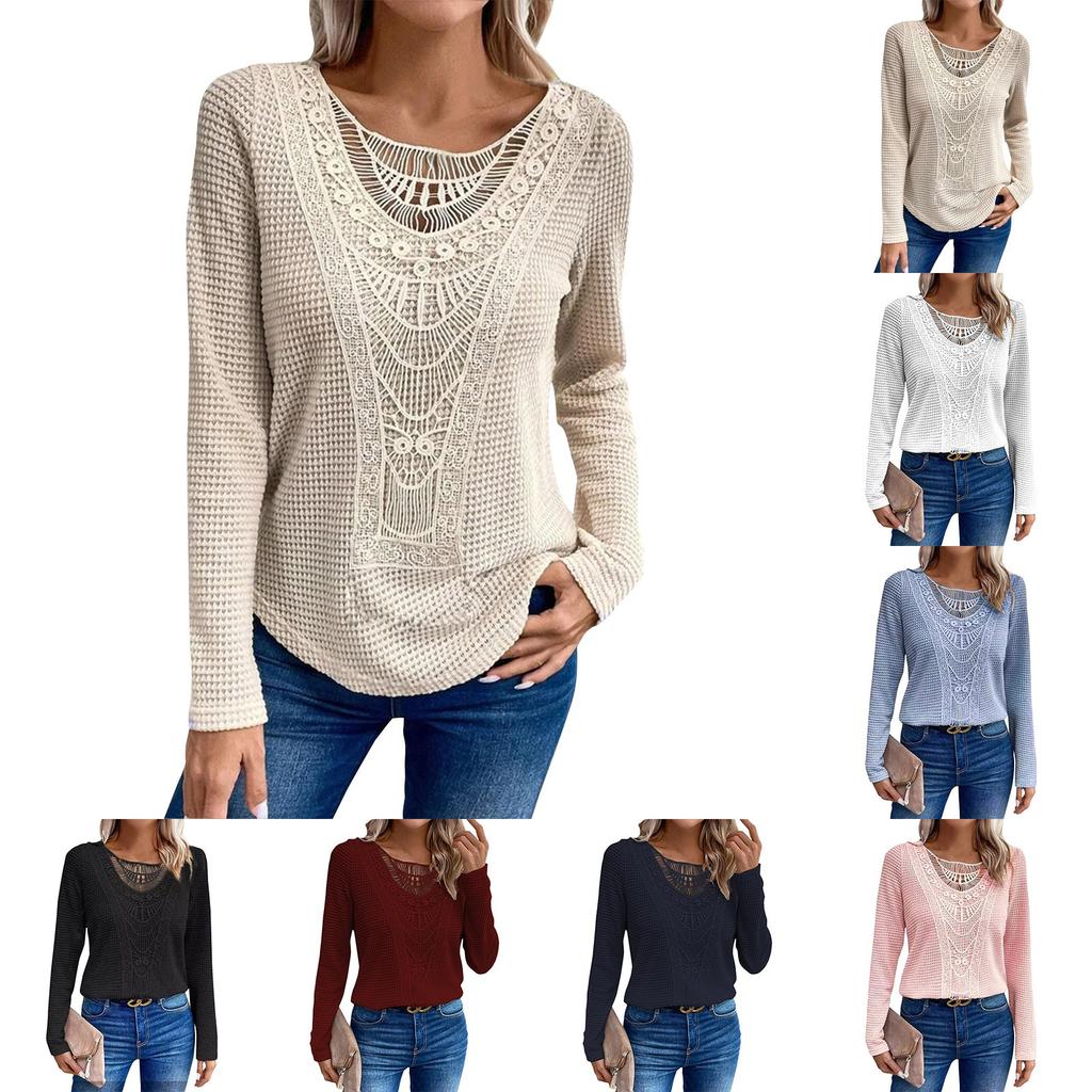 Футболка с длинными рукавами Solid Solor Lace Patchwork с кружевным круглым вырезом для женщин — купить товар онлайн с бесплатной доставкой до всему миру!
