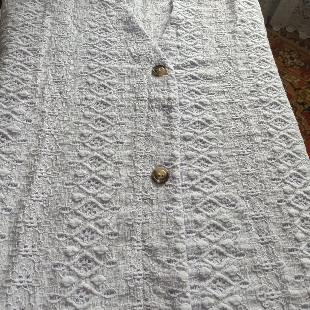 Размер соответствует нашему 56 размеру. Ткань мягкая, приятная к телу. Много дырочек, поэтому бельё под кофточку нужно подбирать по цвету. НО пуговицы вообще не в тему, кто подбирал? А цвет совсем не соответствует фиолетовому, так слегка сиренево-серый. В общем получила не совсем то, что ждала. Будьте осторожнее: китайцы научились фоткать так, что любая вещь выглядит шедевром.