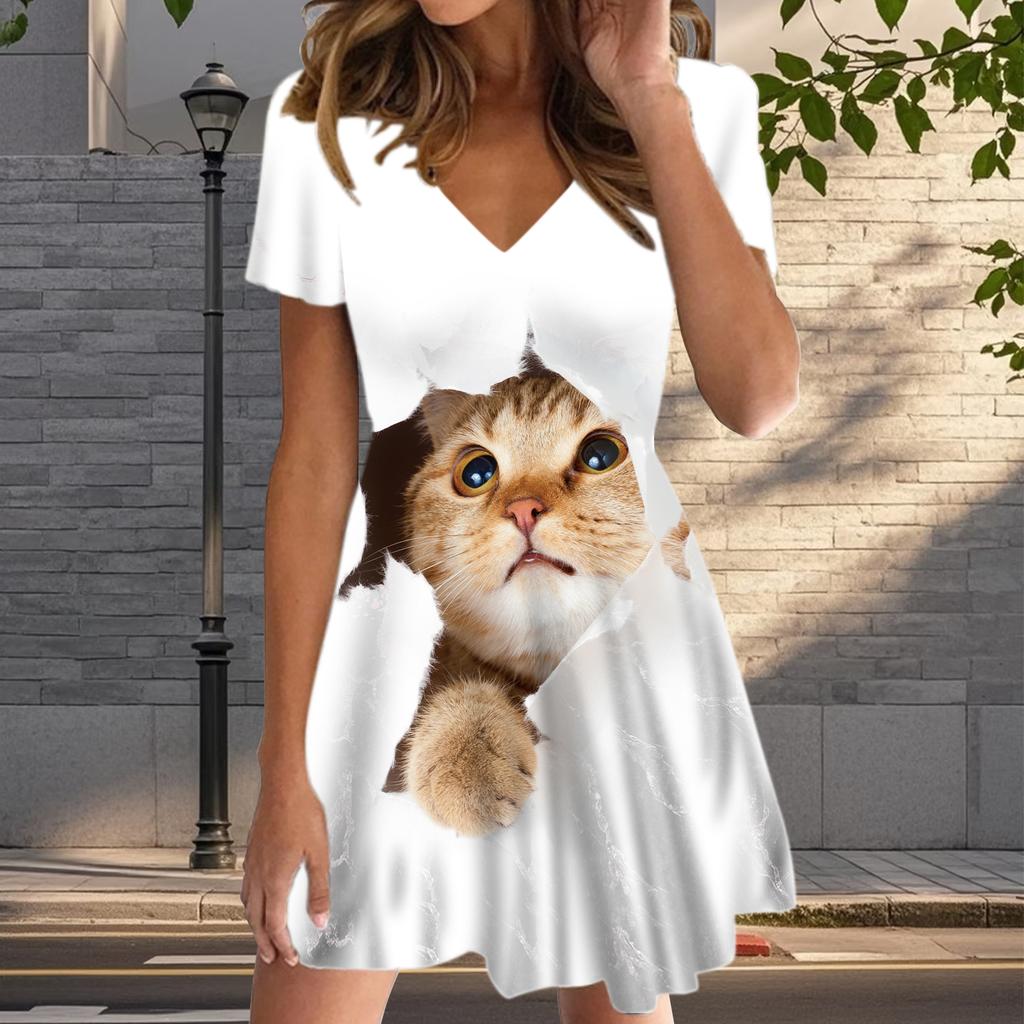 Летняя мода женские V-образный вырез короткий рукав милый кот принт платье сексуальные короткие юбки платья