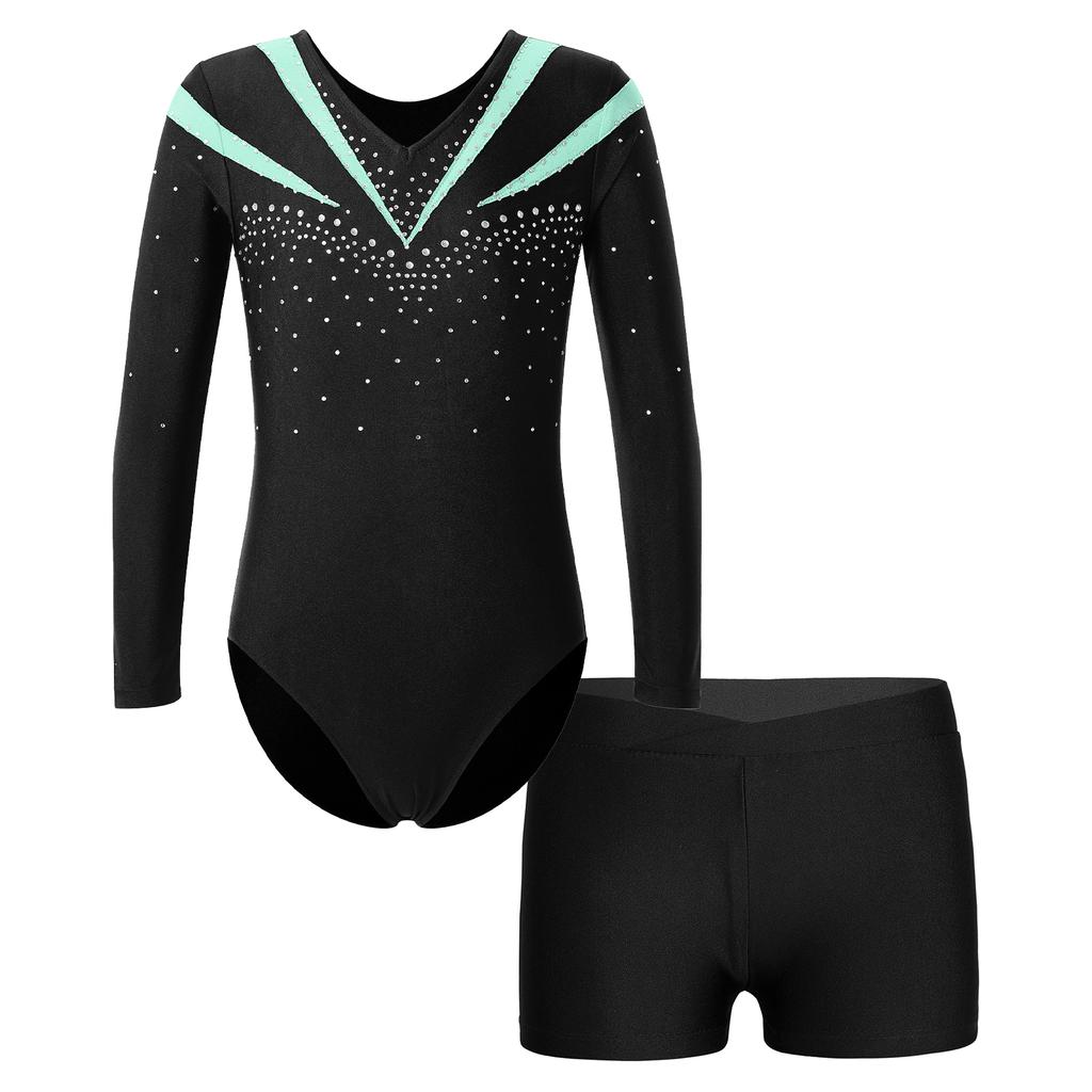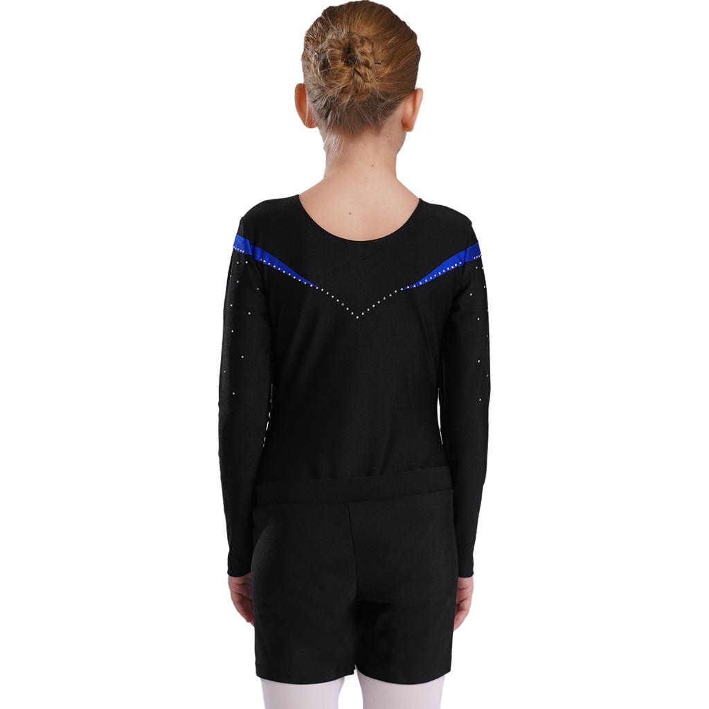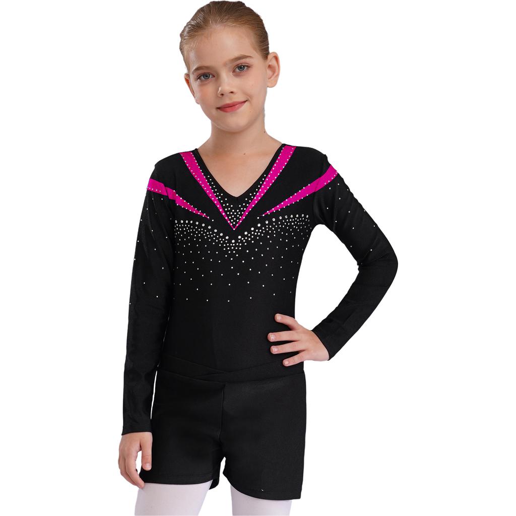Купальник для девочек контрастного цвета с длинным рукавом, V-образным вырезом, украшенный стразами, с V-образным вырезом спереди, шорты для гимнастики