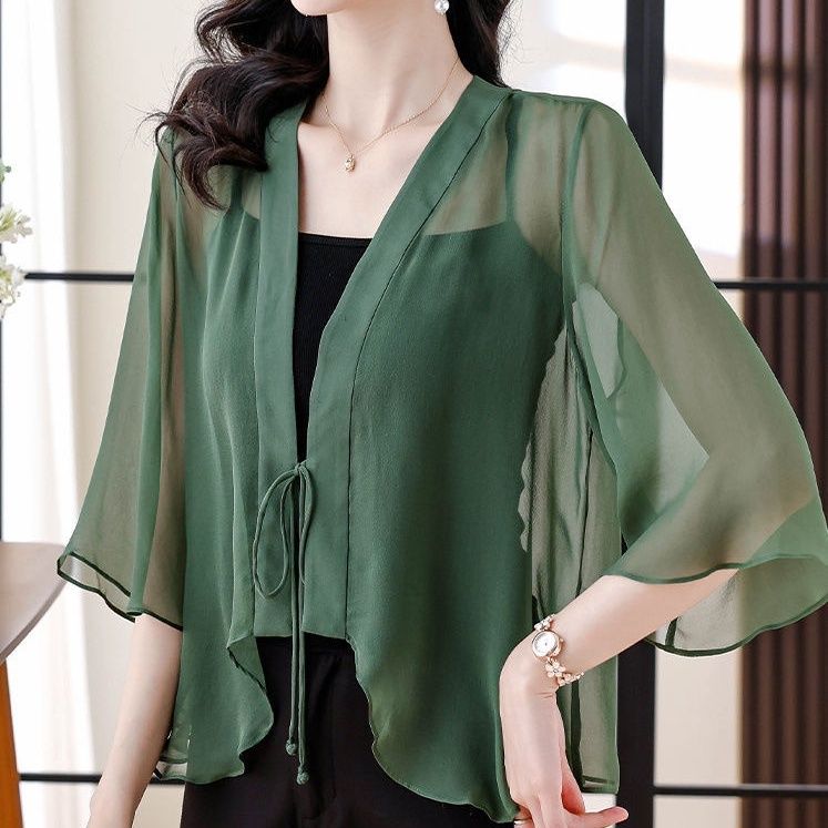 Тонкая Дышащая Блузка из Шифона с Рукавом Семь Четвертей для Женского Летнего Нового Наряда, Кардиган-Жакет с Шалью, Модная Защита от Солнца