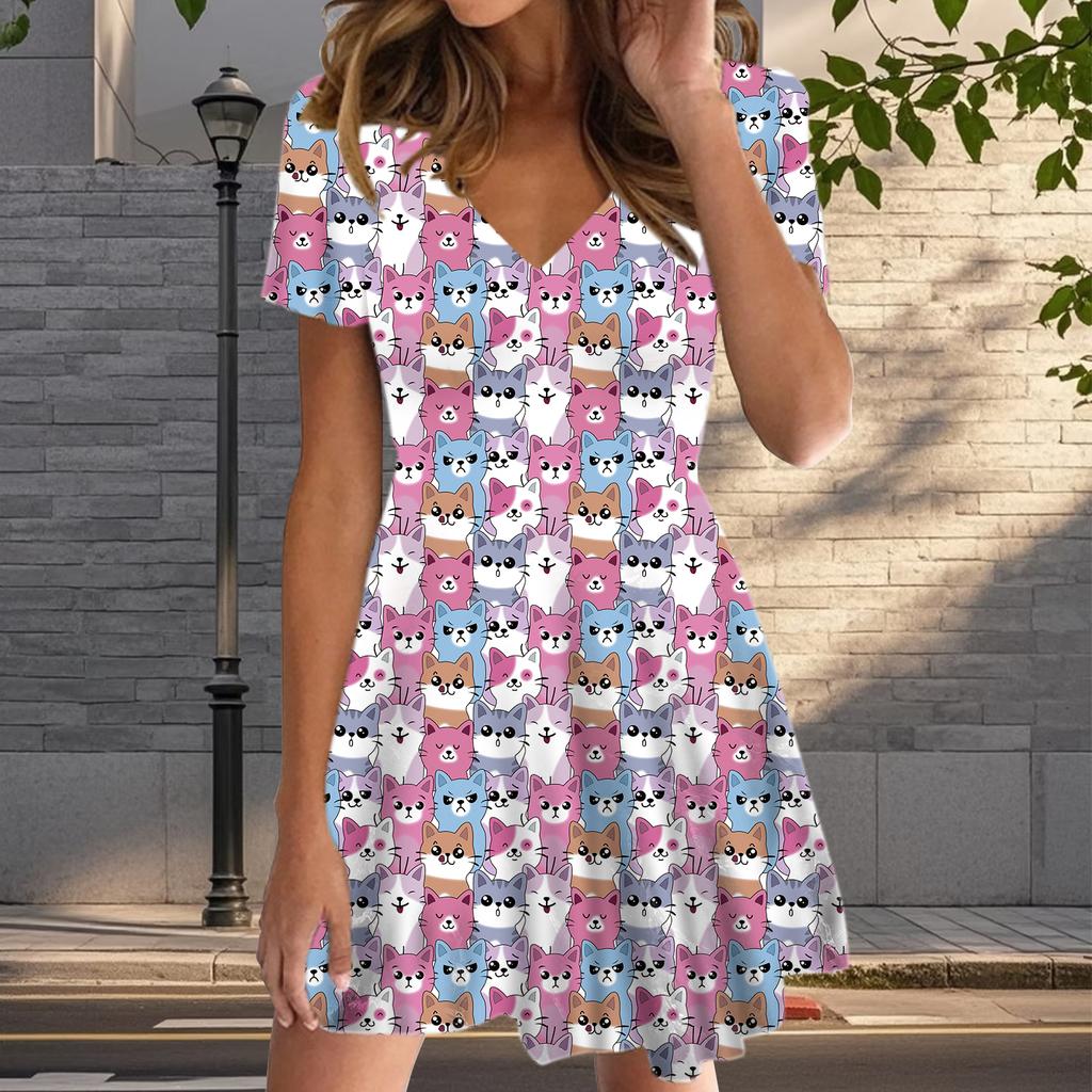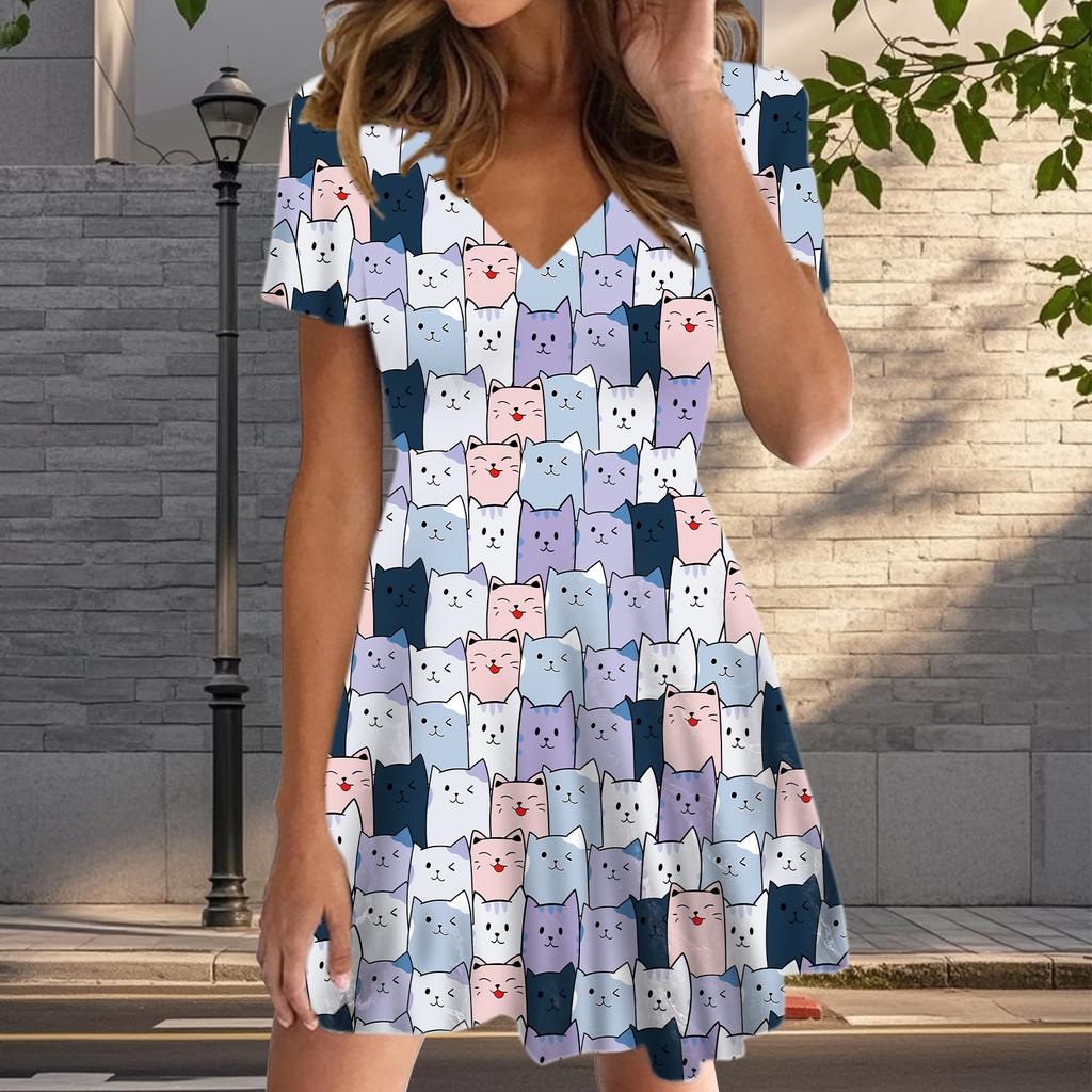 Летняя мода женские V-образный вырез короткий рукав кошачий узор печатных платьев сексуальные короткие юбки платья