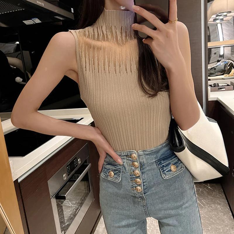Женская летняя модная трикотажная майка с полувысоким воротом, удобная дышащая футболка, тонкий пуловер без рукавов, корсетный топ