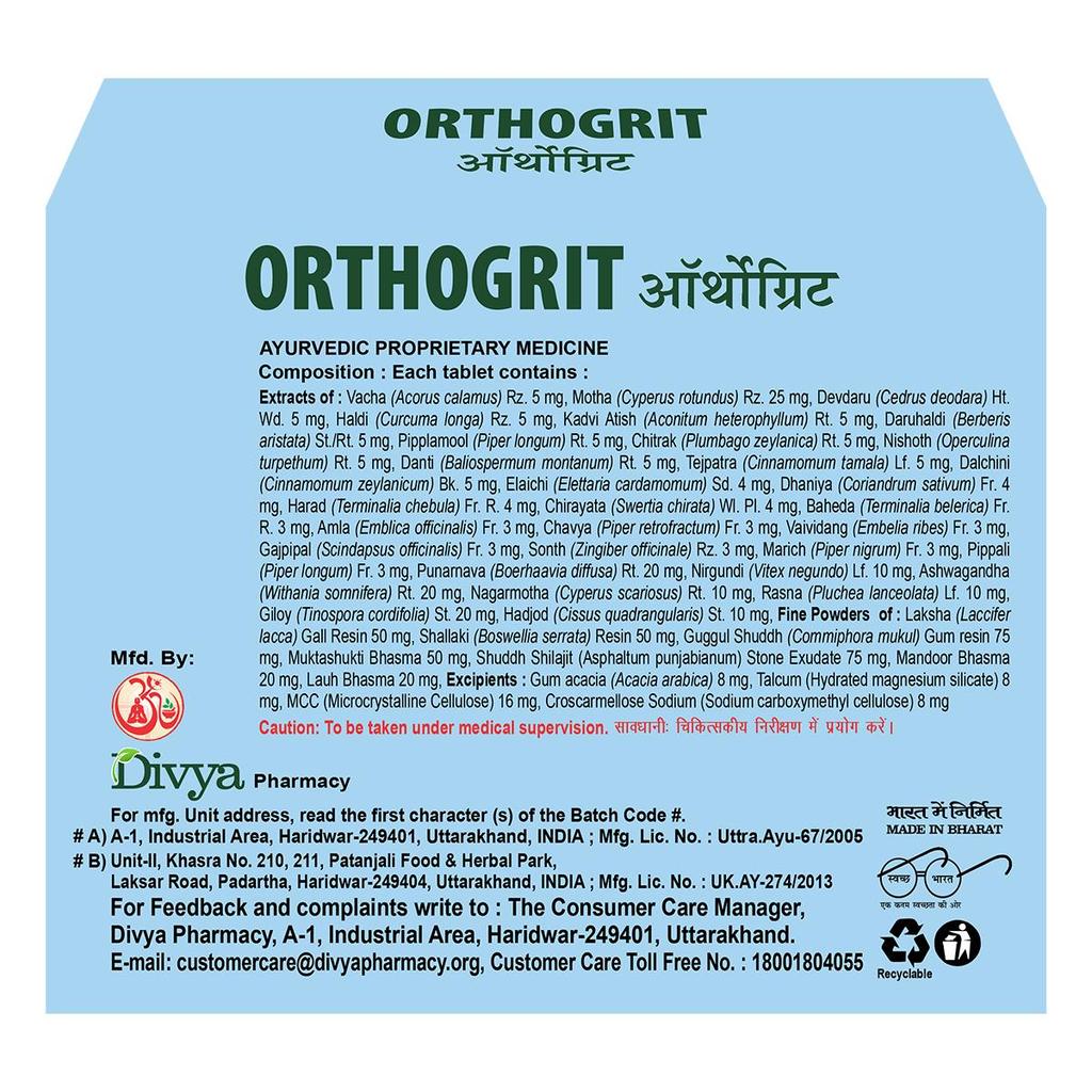Дивья Ортогрит Таблетка - это аюрведическая формула, содержащая смесь традиционных трав и минеральных препаратов.. Он разработан для использования как часть ежедневной оздоровительной рутины в соответствии с аюрведическими практиками, особенно для тех, кто хочет поддержать активный образ жизни и общее опорно-двигательное благополучие.