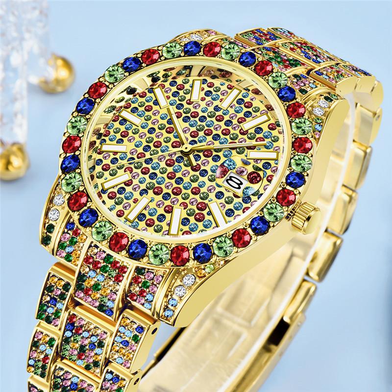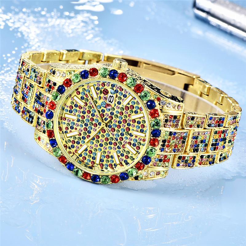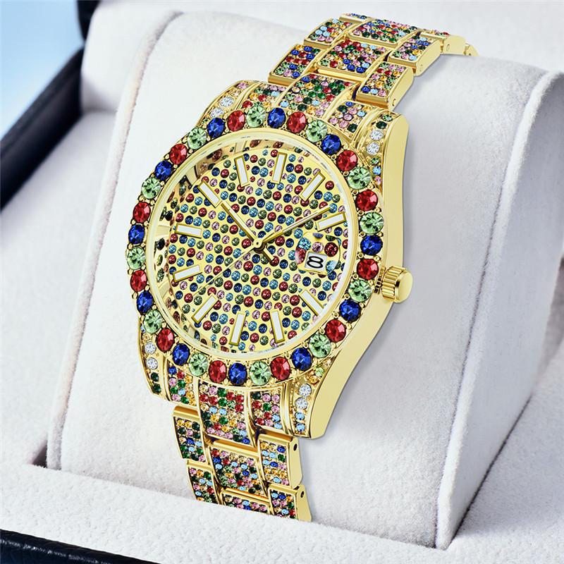 Модные мужские роскошные цветные часы с бриллиантами в стиле хип-хоп с календарем, кварцевые часы, праздничный подарок, мужские изысканные подарочные часы