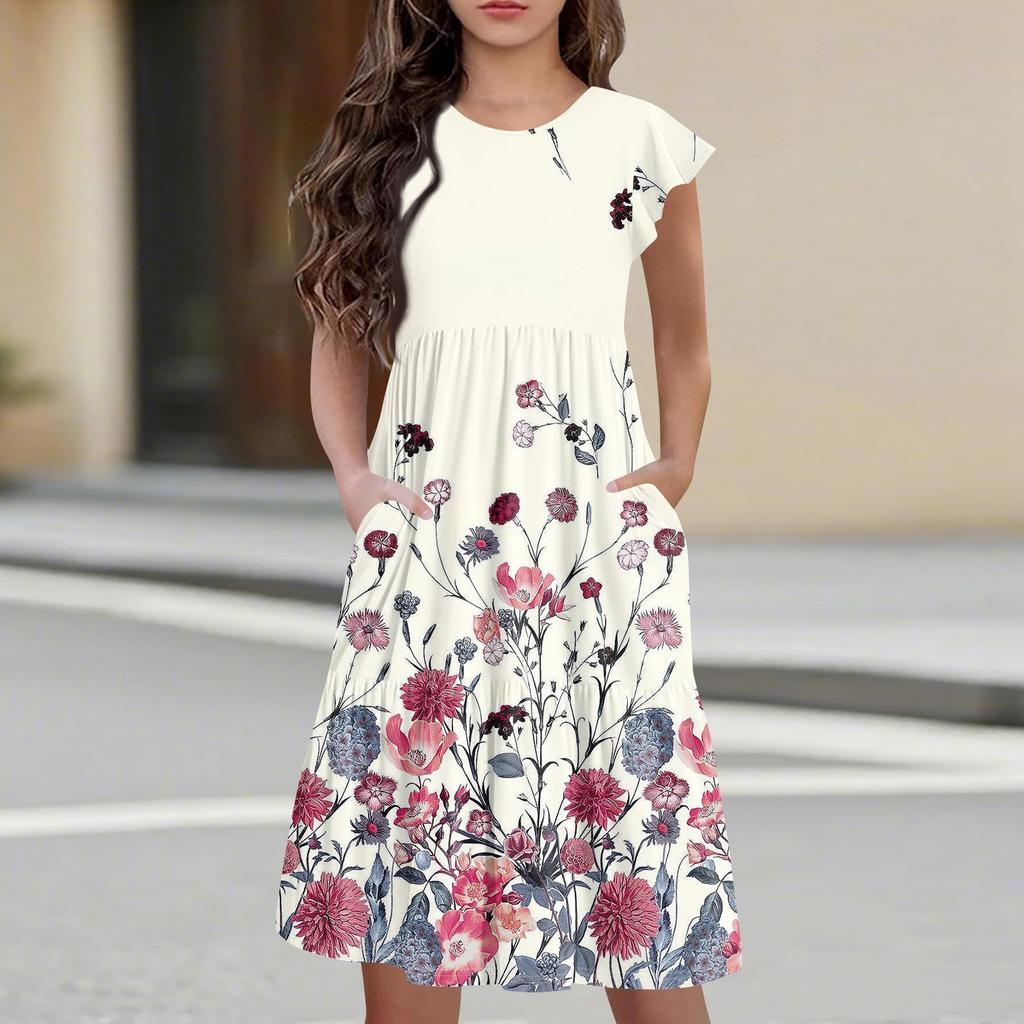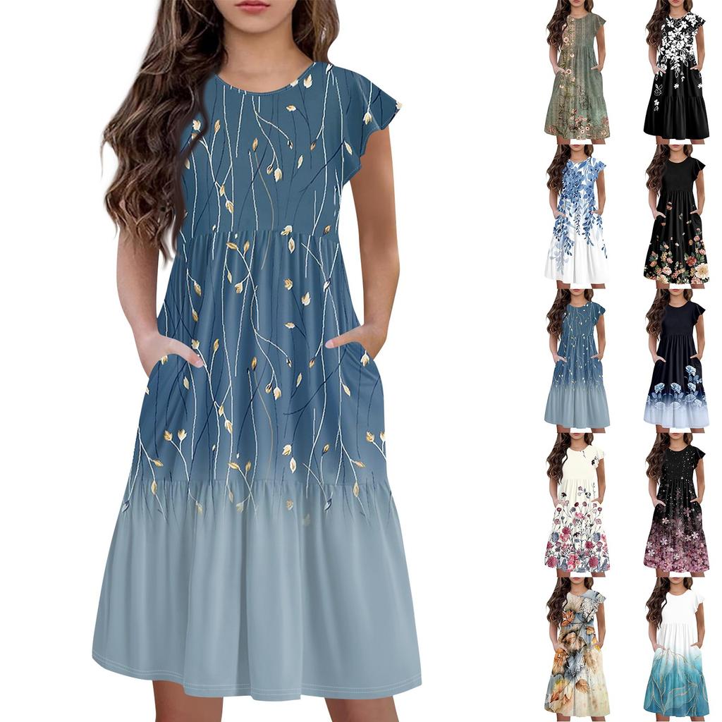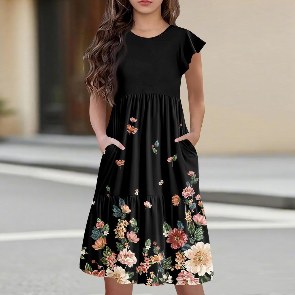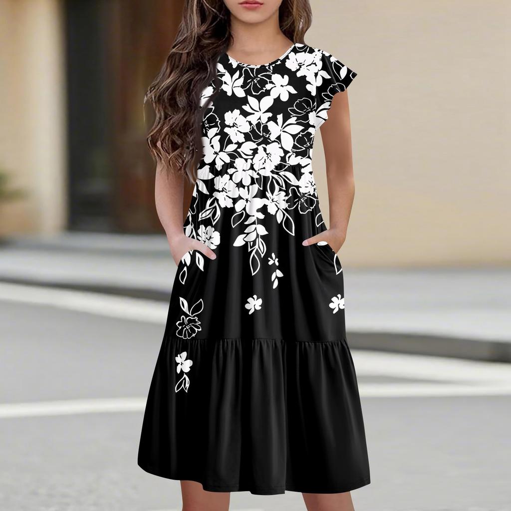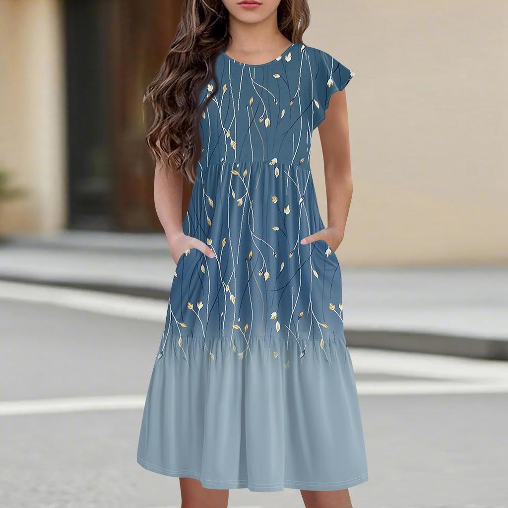Детская юбка с круглым вырезом, плиссированная, с коротким рукавом, юбка принцессы, модное повседневное платье с карманами для девочек