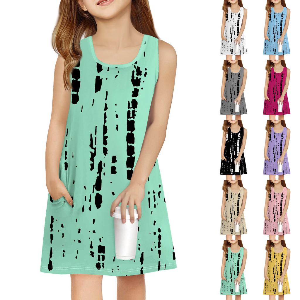 Летнее платье для девочек без рукавов с принтом, повседневное платье с карманом