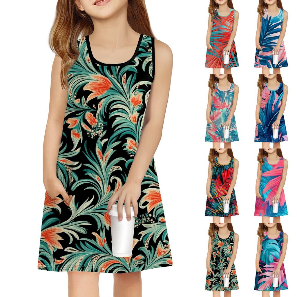 Летнее платье для девочек без рукавов с принтом, повседневное платье с карманом