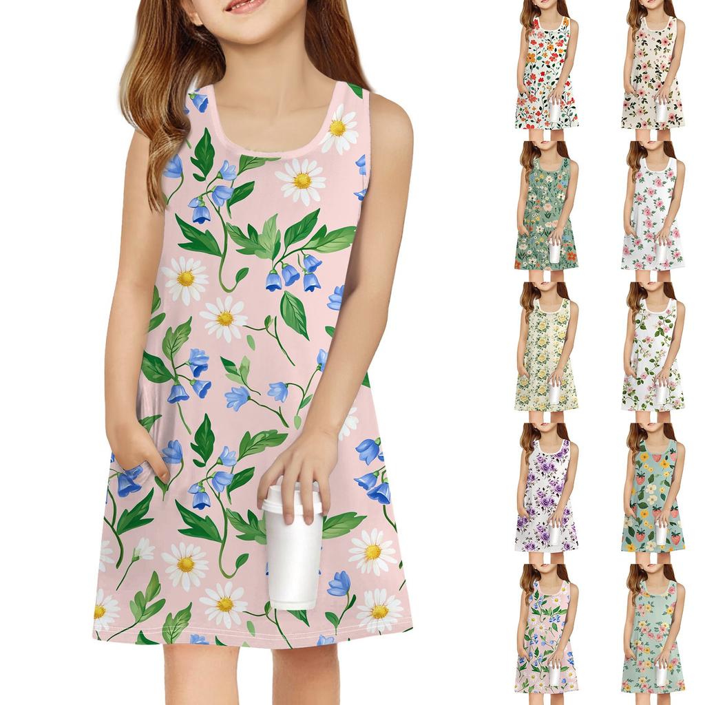 Летнее платье для девочек без рукавов с принтом, повседневное платье с карманом