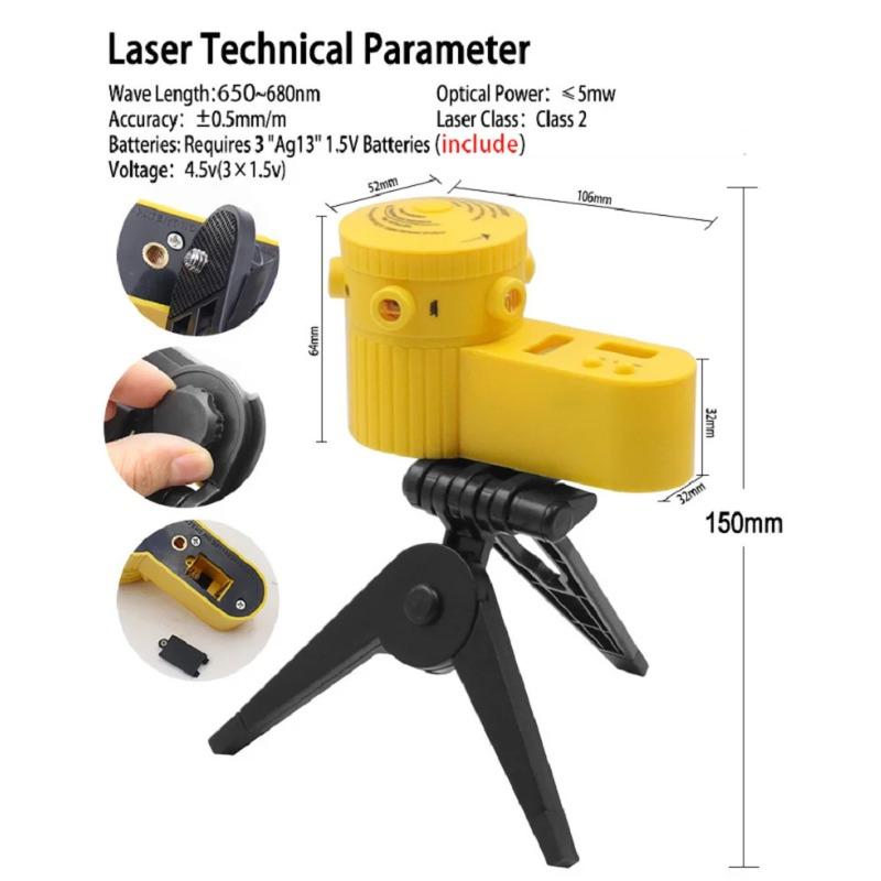 Характеристики:1.6 режимы: Перекрестная линия, точечный индикатор, линия уровня земли, вертикальная линия, линия уровня, светодиодный ночной вид. 2. С вертикальными и горизонтальными водяными столбами и светодиодным индикатором. 3. Легкий, практичный и полнофункциональный, это незаменимый инструмент для бытовых измерений. 4. Высокая точность, подходит для более точной работы. 5. В комплект входит штатив ножничного типа.