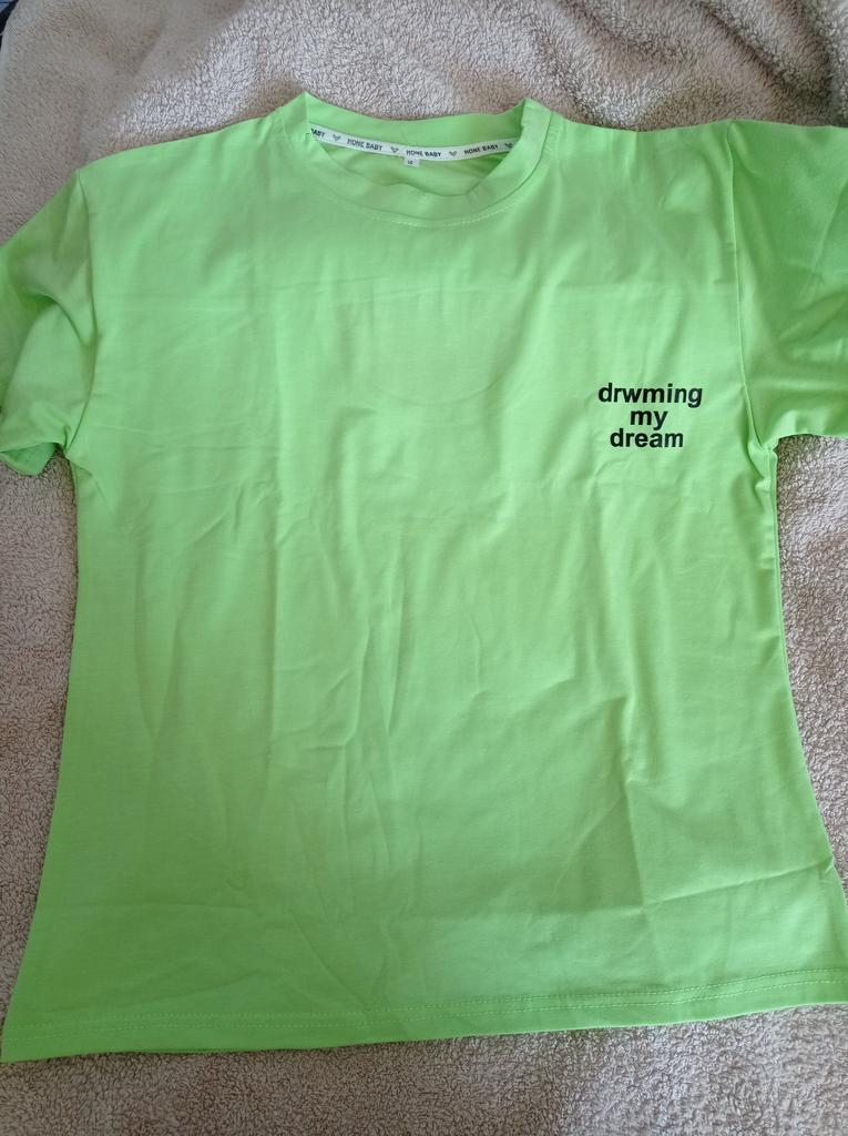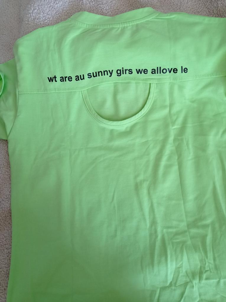 Этой покупкой очень довольна. Стильный, яркий, летний комплект. Хотя и написано в презентации, что полиэстер, но выглядит как натуральный хлопок. Да и на ощупь сродни хлопку. Фото несколько искажают цвет - красивая зелень, цвет наиболее близок в фото шорт. Описание продавца очень близки к реалиям (отличаются лишь на пару сантиметров, что при оверсайз не критично).
