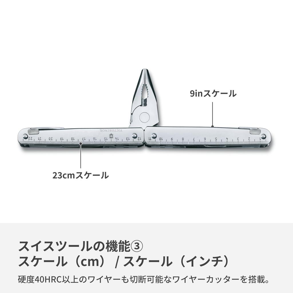 Основные функции: Штопор, плоскогубцы, кусачки (проволока с твердостью менее 40 HRc), кусачки для твердой проволоки, большое лезвие, ножницы, пила, крестовая отвертка (Филлипс тип 1/2), уширитель (бурение), нож для консервных банок, плоская отвертка 3 мм, дырокол, плоская отвертка 5,5 мм, открывалка для ящиков (металлический рычаг), проволочный гибочный станок (гибка проволоки), пила по металлу, напильник по металлу, плоская отвертка 2,5 мм, стамеска 7 мм, инструмент для зачистки проводов, скребок для проводов, линейка (дюймовый), масштаб (см), скребок, крестовая насадка 0 (отвертка Филлипс), немного: Torx 10, бита Torx 15, плоская отвертка (маленький)