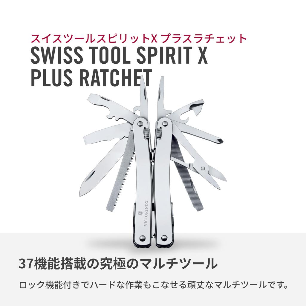 Основные функции: Штопор, плоскогубцы, кусачки (проволока с твердостью 40 HRc или менее), кусачки для твердой проволоки, большое лезвие, ножницы, пила, крестовая отвертка (Филлипс тип 1/2), развертка, резак для консервных банок, плоская отвертка 3 мм, дырокол, плоская отвертка 5,5 мм, открывалка для ящиков (металлический рычаг), Гибочный станок для проволоки (гибка проволоки), пила по металлу, напильник по металлу, плоская отвертка 2,5 мм, стамеска 7 мм, инструмент для зачистки проводов, скребок для проводов, линейка (дюймовый), масштаб (см), скребок, ключ для бит, кейс для бит, бита Phillips 0 (Philips отвертку), Бит Torx 10, бит Torx 15, место для дополнительных бит, отвертка, штопор,