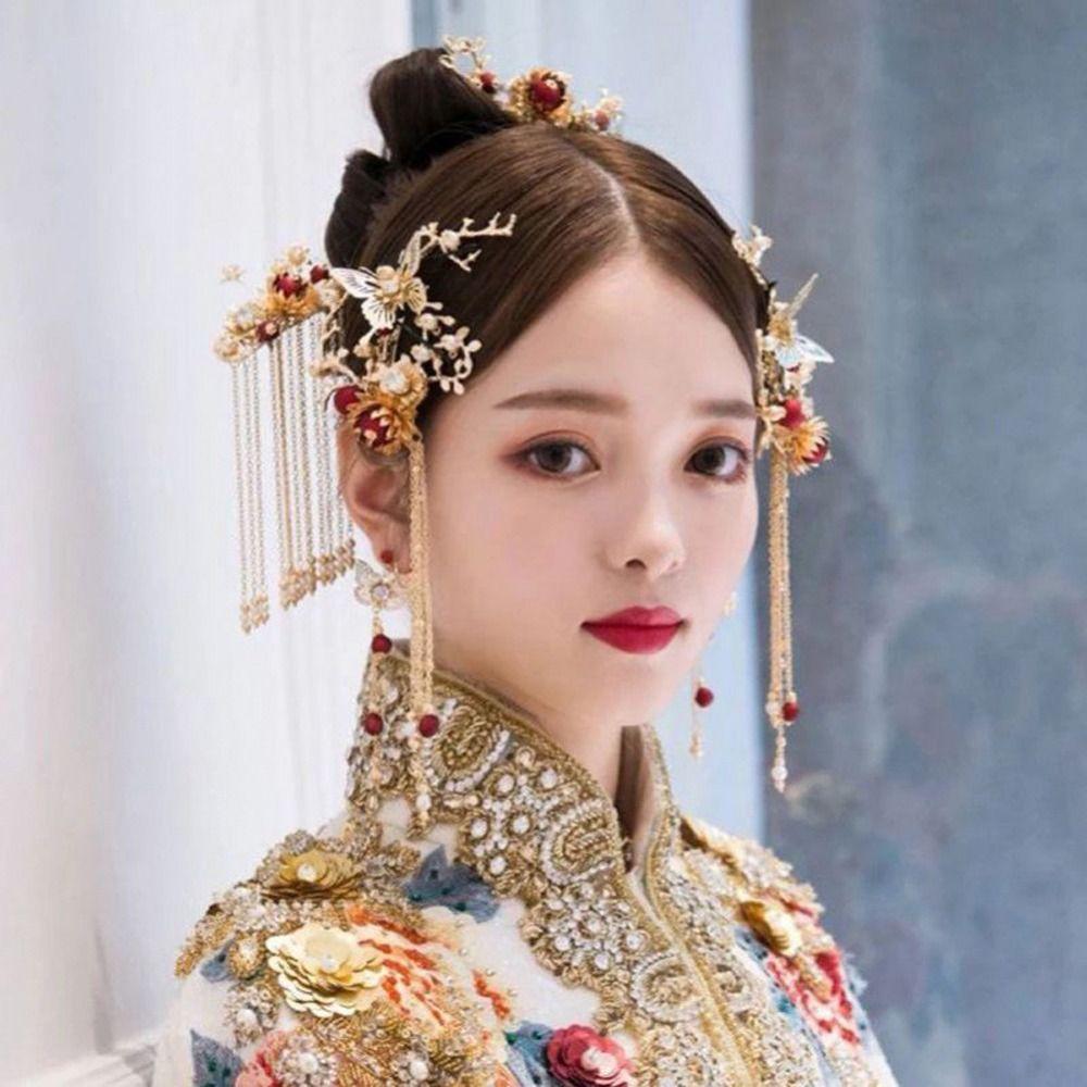 Цветочные гребни для волос со стразами Серьги в китайском стиле Корона для волос Свадебный комплект ювелирных изделий