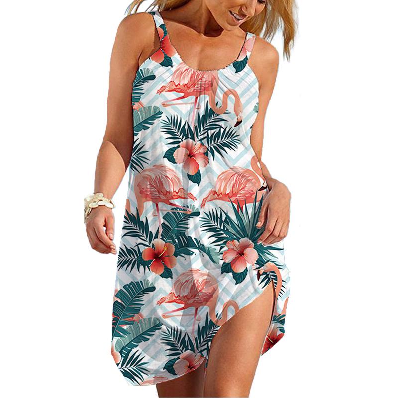 Летнее новое пляжное платье с 3D-принтом «Фламинго», сексуальное гавайское платье с рукавами-бретельками, свободная повседневная домашняя женская одежда