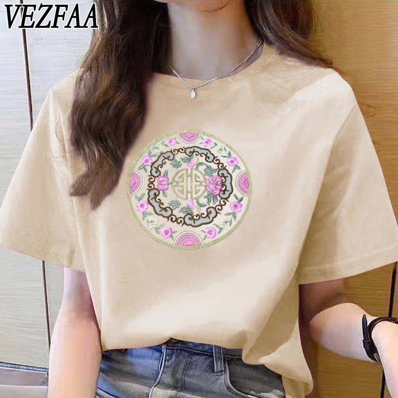 VEZFAA Женские модные повседневные летние весенние блузки и рубашки с цветочным узором и коротким рукавом с круглым вырезом