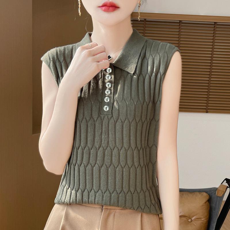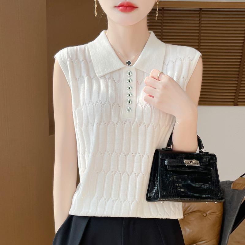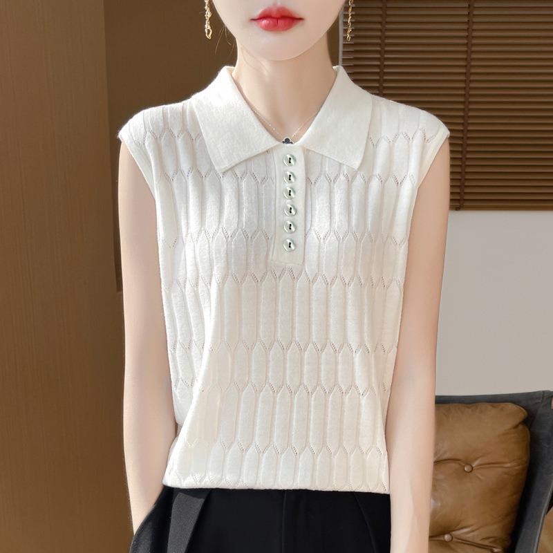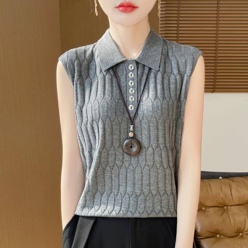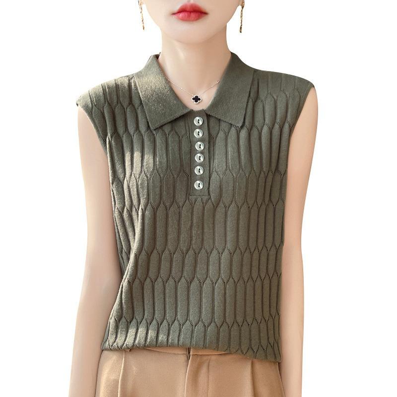 Женская весенняя новая шерстяная камвольная трикотажная жилетка с воротником-поло, однотонная, свободная, без рукавов, внутренняя одежда