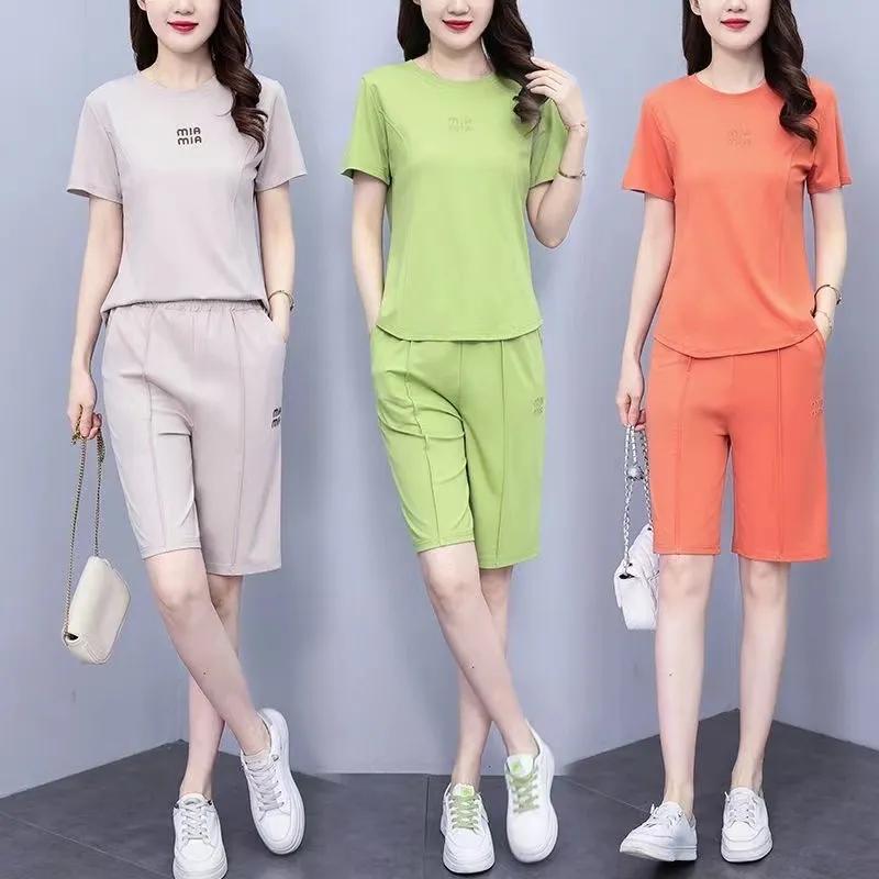 Женский летний повседневный спортивный костюм с круглым вырезом и коротким рукавом, комплект из двух предметов + брюки