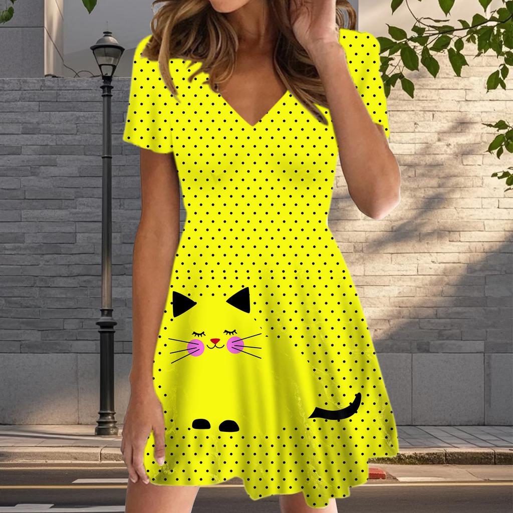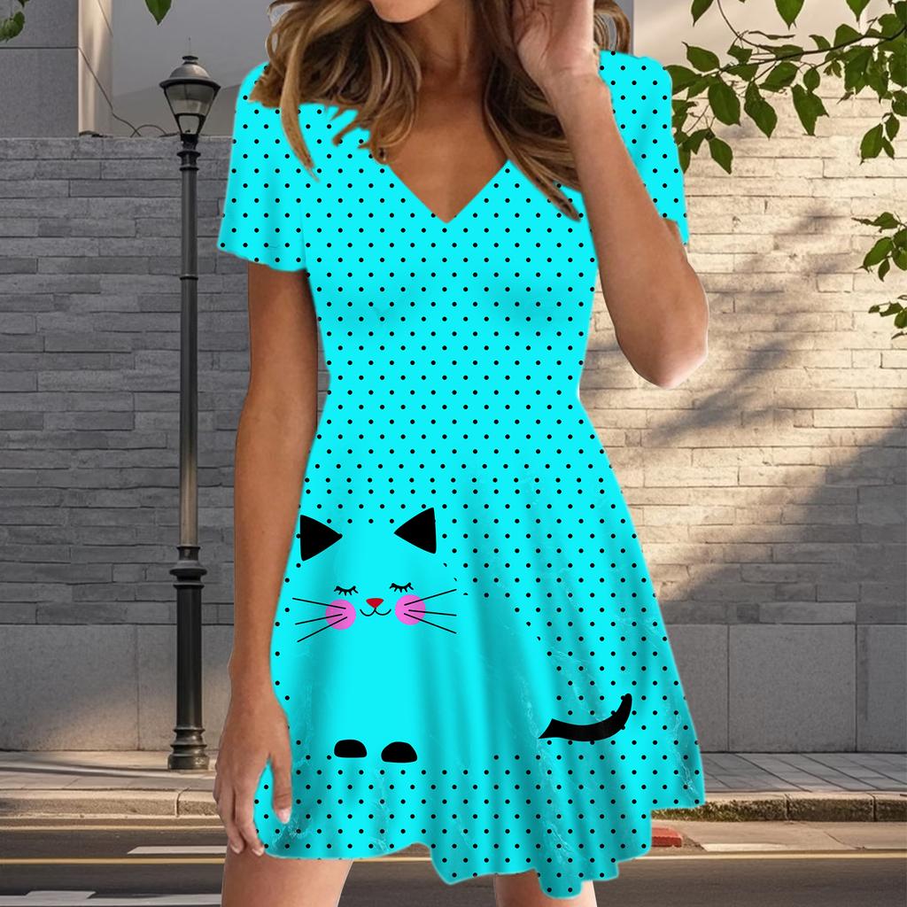 Летняя мода женские V-образный вырез короткий рукав котенок принтованное платье сексуальные короткие юбки платья