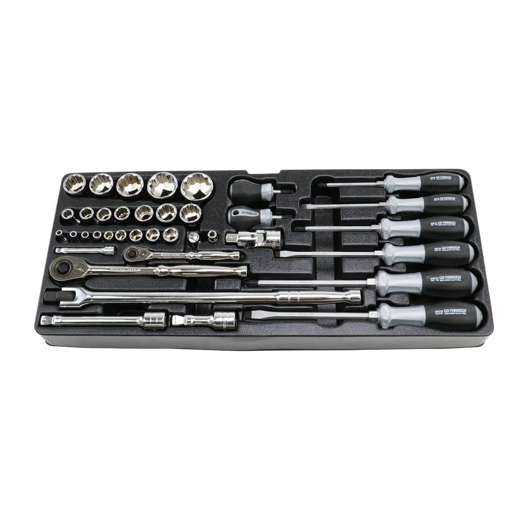Установить содержимое: 12.7кв розетка (10, 12, 13, 14, 17, 19, 21, 22, 24, 27, 30, 32 мм), 12,7 кв.м 2-сторонний удлинитель (75, 150мм), Универсальный шарнир 12,7 кв. м, компактная головка 12,7 кв. м, рукоятка храпового механизма 245 мм, вращающаяся рукоятка 12,7 кв. м 380 мм.