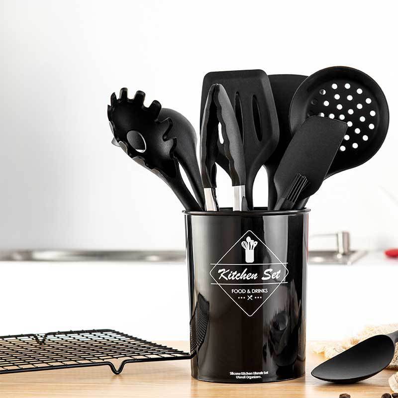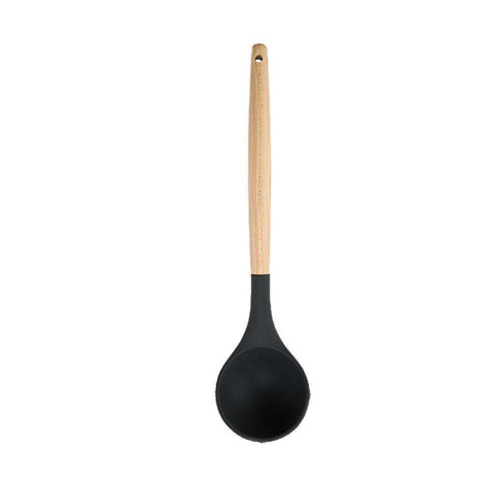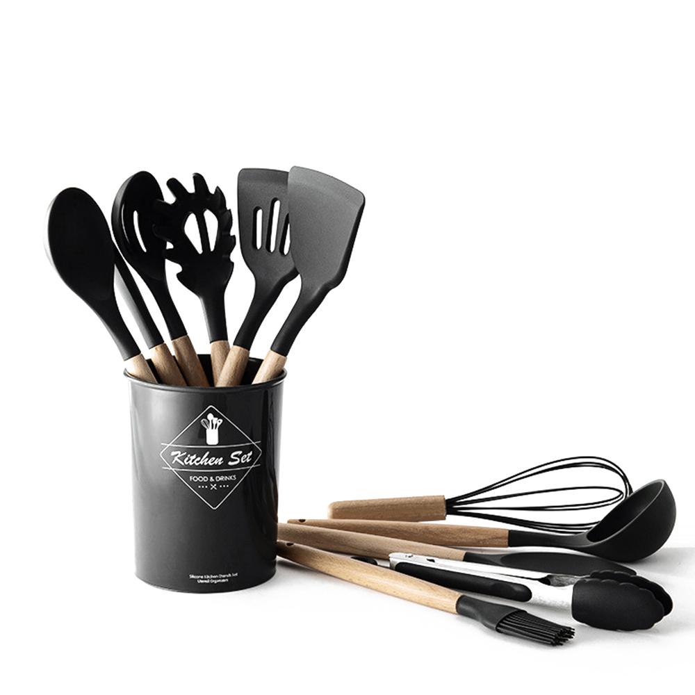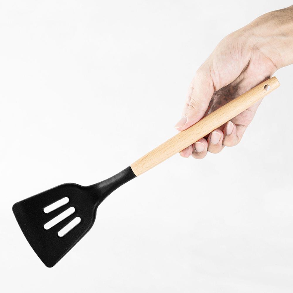 Силиконовая кухонная утварь, набор черных антипригарных кухонных принадлежностей, лопатка, венчик для взбивания яиц, деревянная ручка, набор кухонных принадлежностей для приготовления пищи