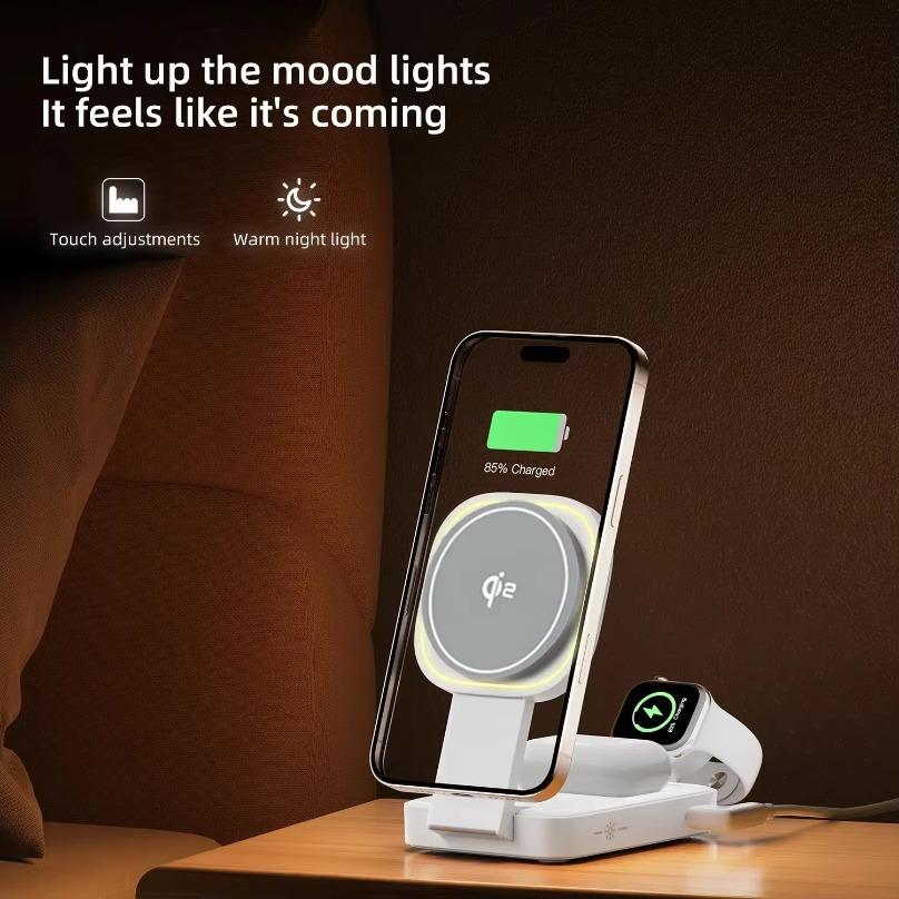 Характеристики : Многофункциональный,Складной,С индикатором зарядки,С кабелем,Для нескольких устройств,Со светодиодной подсветкой,Сертификация Qi,С держателем,Магнитные беспроводные зарядные устройства