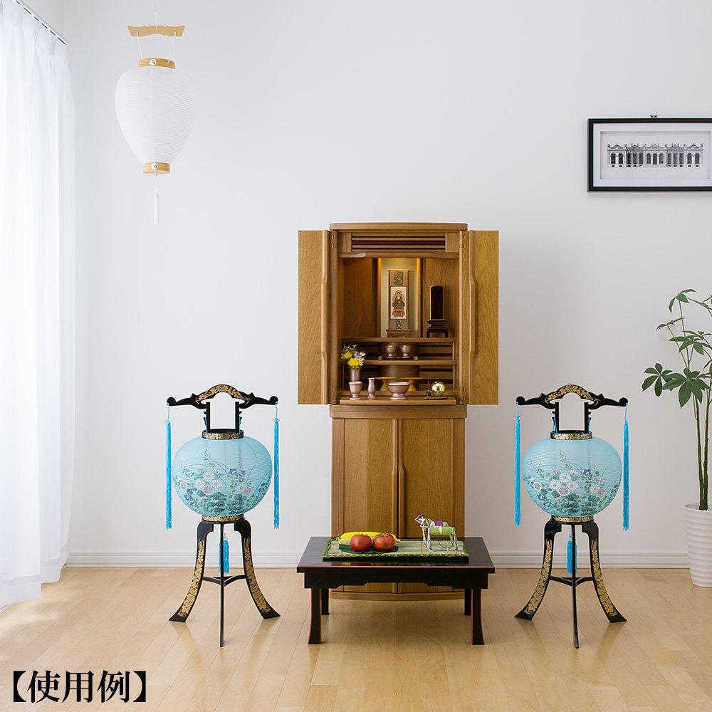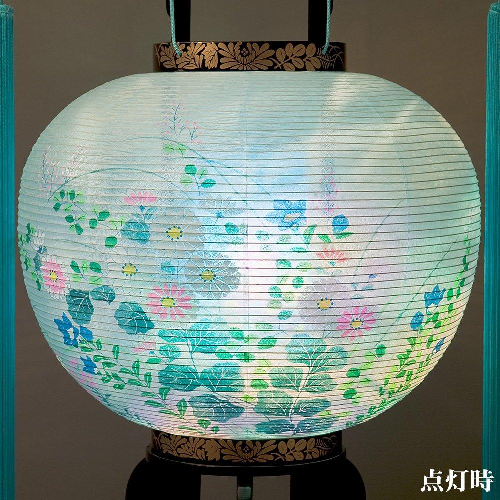 Этот фонарь Обон изготовлен из прохладной светло-голубой бумаги васи для топки и украшен великолепным узором «розовые хризантемы».