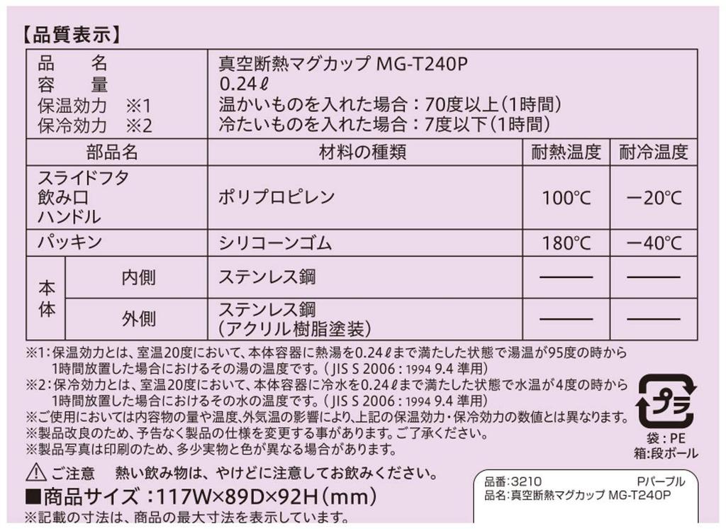 Asbel Thermal Insulating Mug Mug 240ml Pearl Purple Width x Depth x Height With Lid MG-T240 12.3 9.3 10.3cm