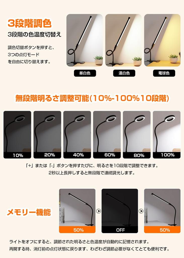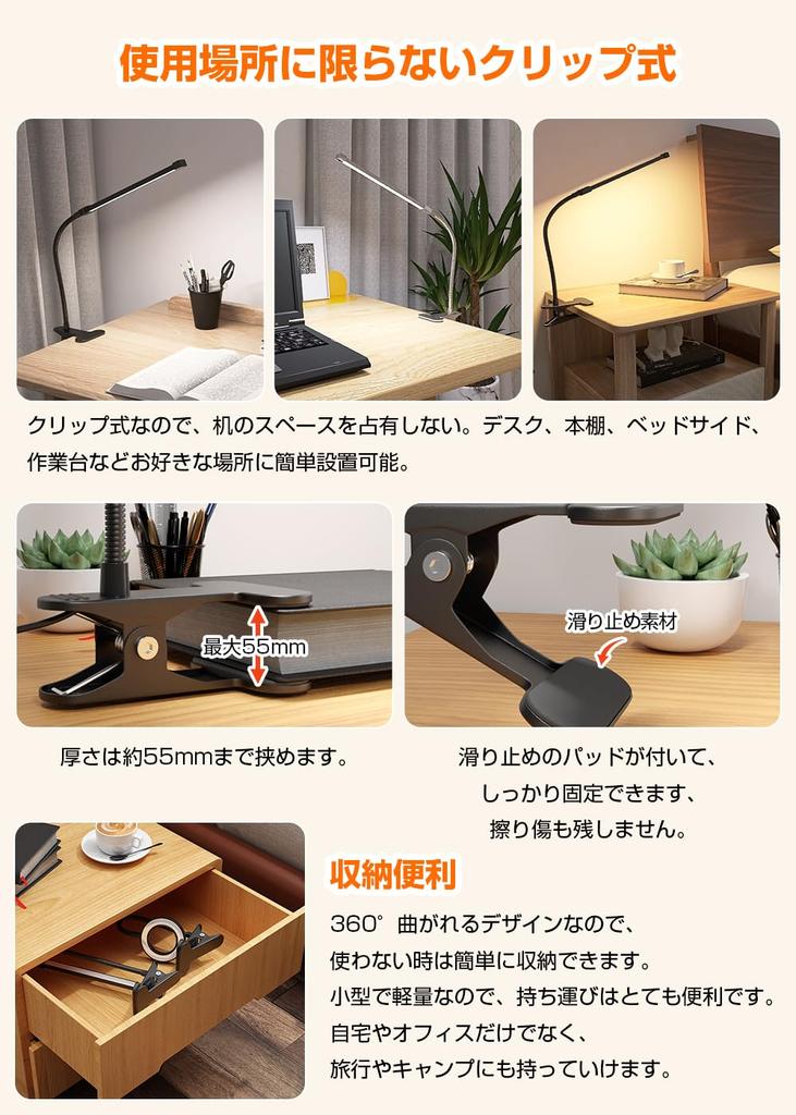 [Тип зажима и регулируемый угол наклона 360°] Матовое УФ-покрытие от пыли предотвращает прилипание пыли и отпечатков пальцев, а текстура и внешний вид дополнительно улучшены. Светильник-клипсу можно закрепить на столе толщиной не более 5,5 см.. Зажим имеет нескользящую накладку, которая позволяет надежно зафиксировать его и не оставляет царапин.. Он использует гибкий кронштейн, который свободно сгибается, что позволяет тонко регулировать высоту и угол наклона, а также обеспечивает всенаправленное освещение.. Его можно свободно регулировать в соответствии с использованием и окружающей средой.. Так как это зажимной тип, он не занимает места на столе.. Легко устанавливается в любом удобном месте, например, на столе, книжной полке, тумбочке кровати, рабочем столе и т. д.. Идеально подходит для читальных залов, спален, кабинетов, офисов, художественных студий, архитектурных дизайн-студий и других помещений.