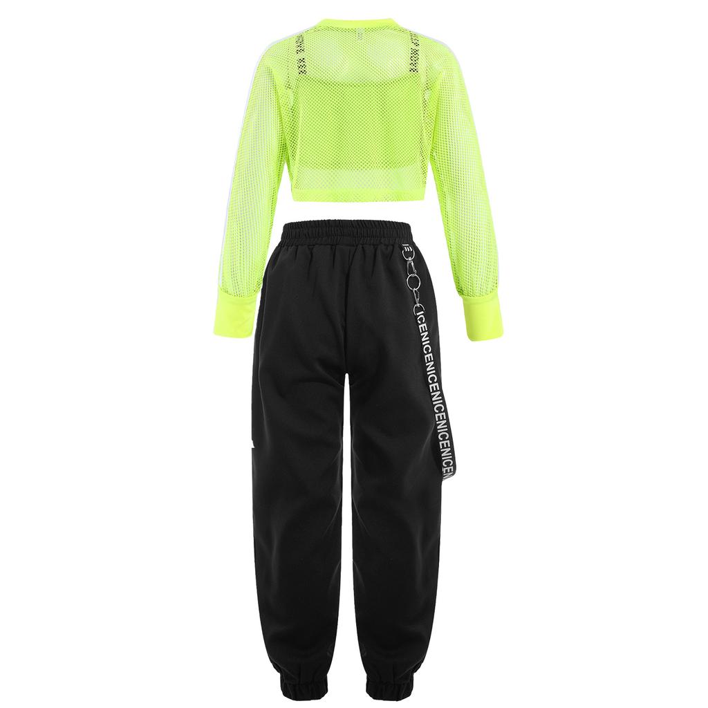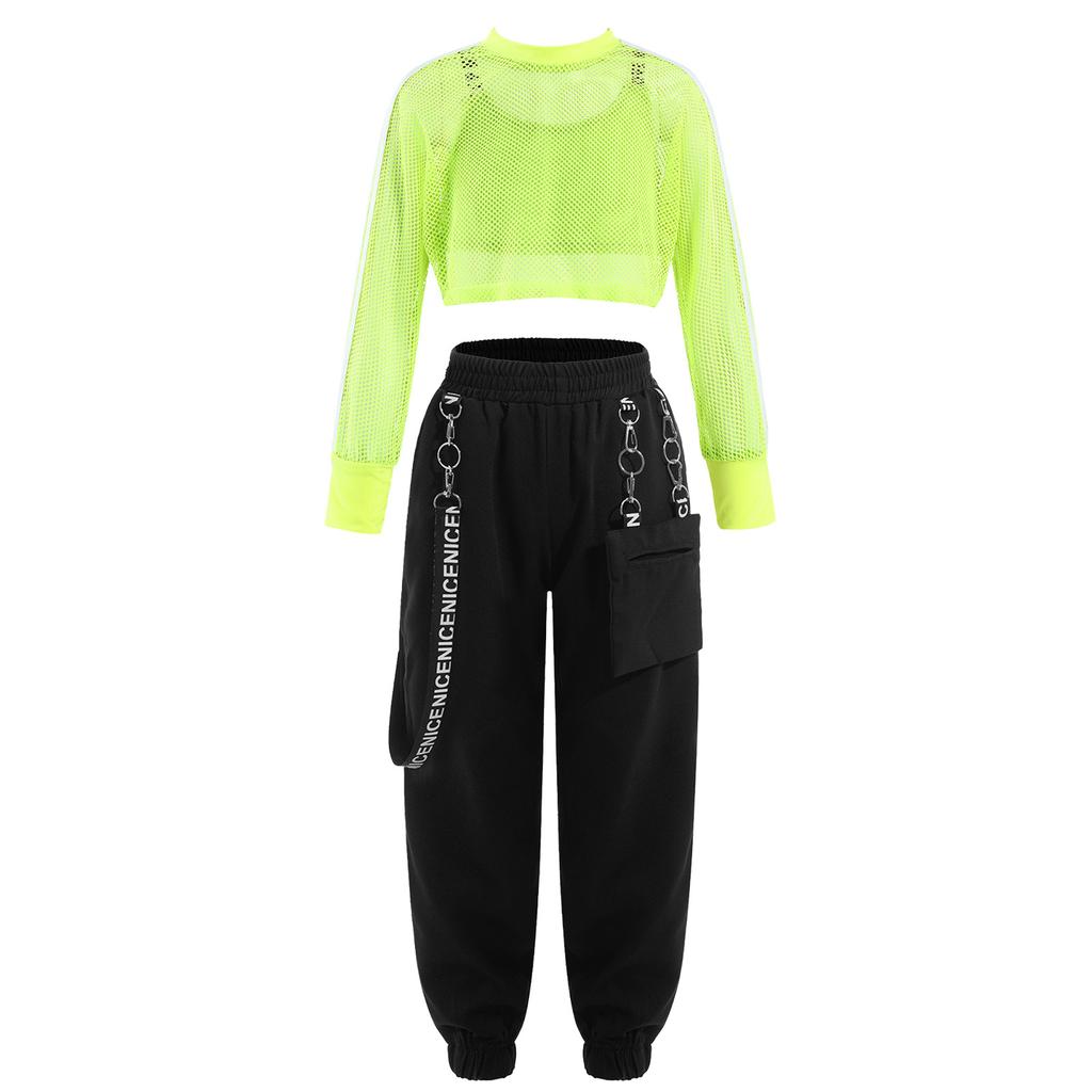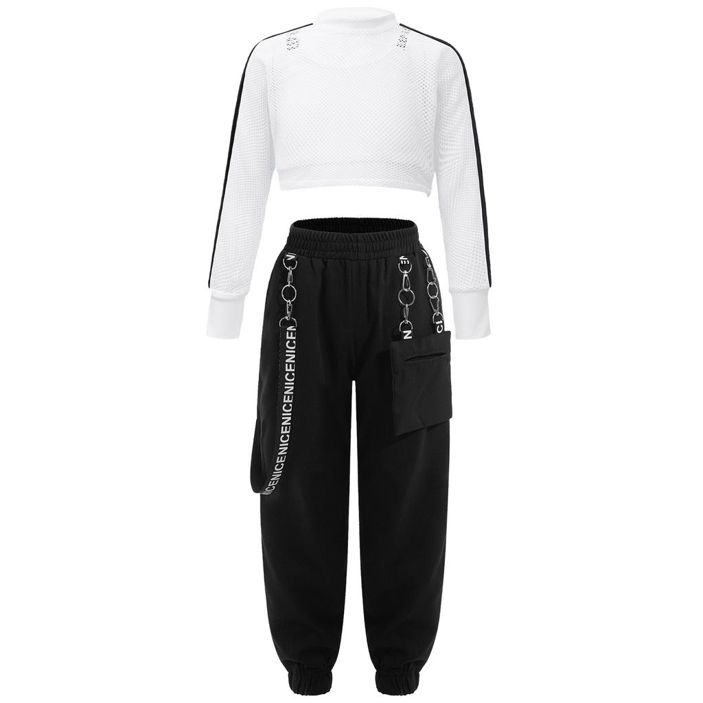 Спортивный танцевальный наряд для девочек, комплект из 3 предметов, сетчатый укороченный топ с буквенным принтом, жилет с металлической цепочкой, брюки для хип-хопа, скейтбординга