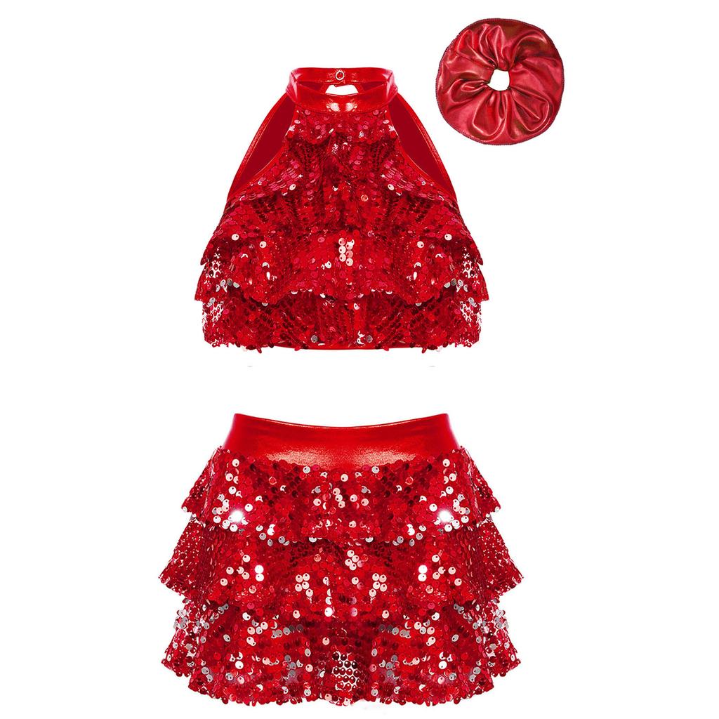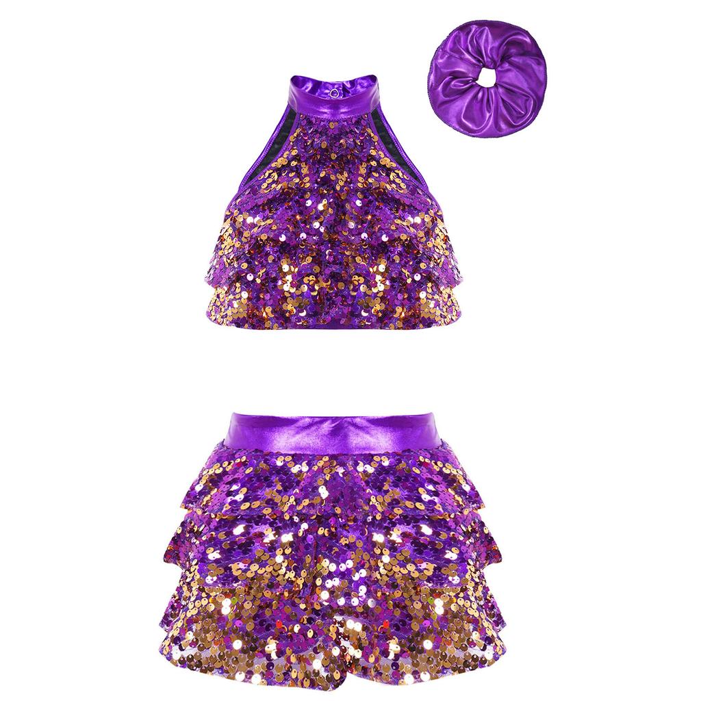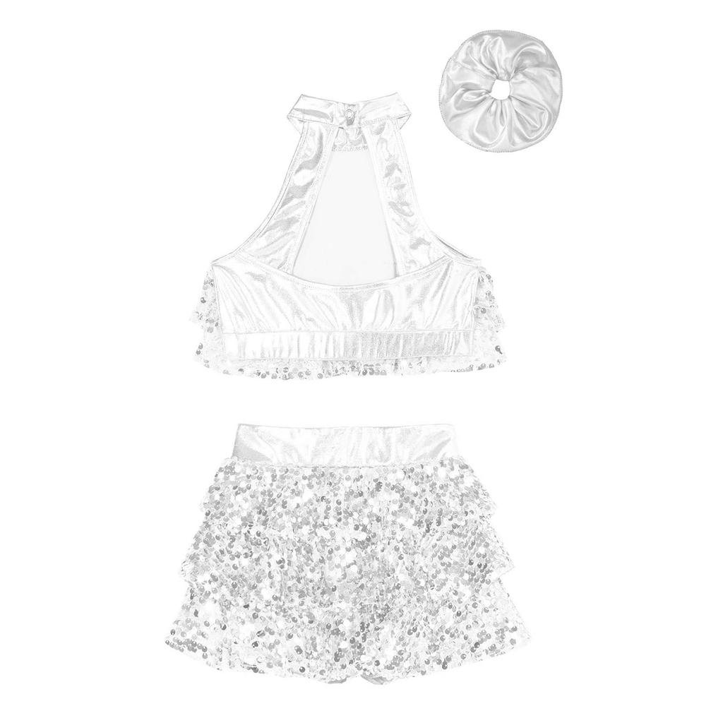 Детский блестящий танцевальный костюм для девочек, укороченный топ с воротником-стойкой, брюки-кюлоты с оборками и блестящей повязкой для волос для соревнований