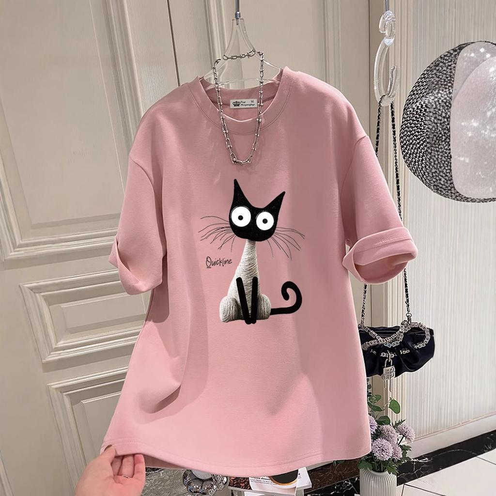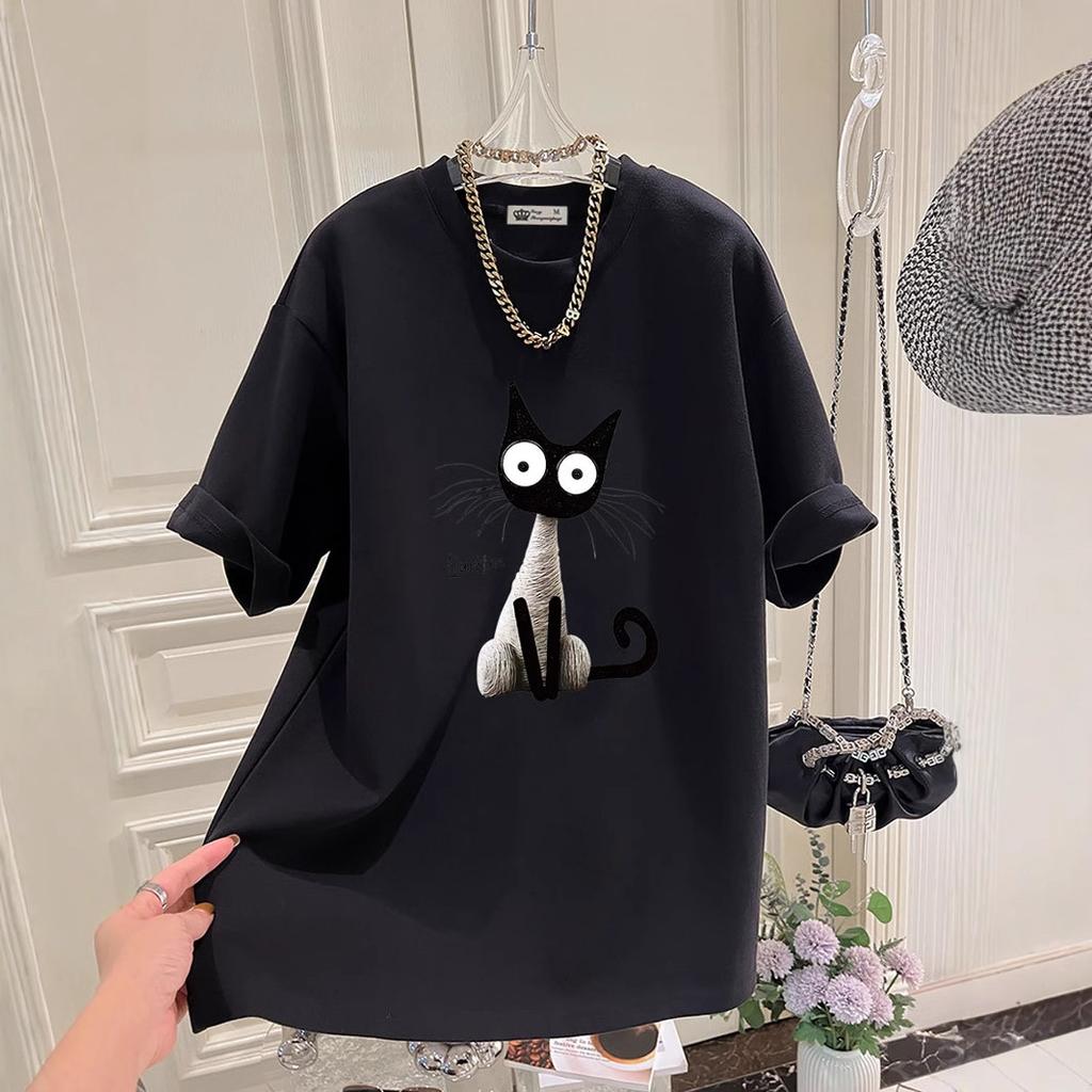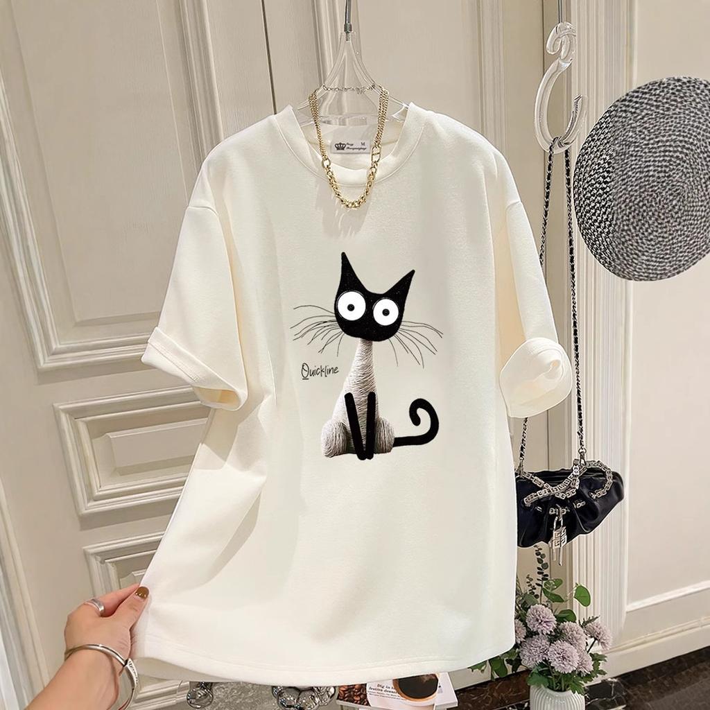 Новая летняя ретро-кошка, модная большая версия, свободная белая футболка с короткими рукавами для женщин, средняя длина, ягодицы