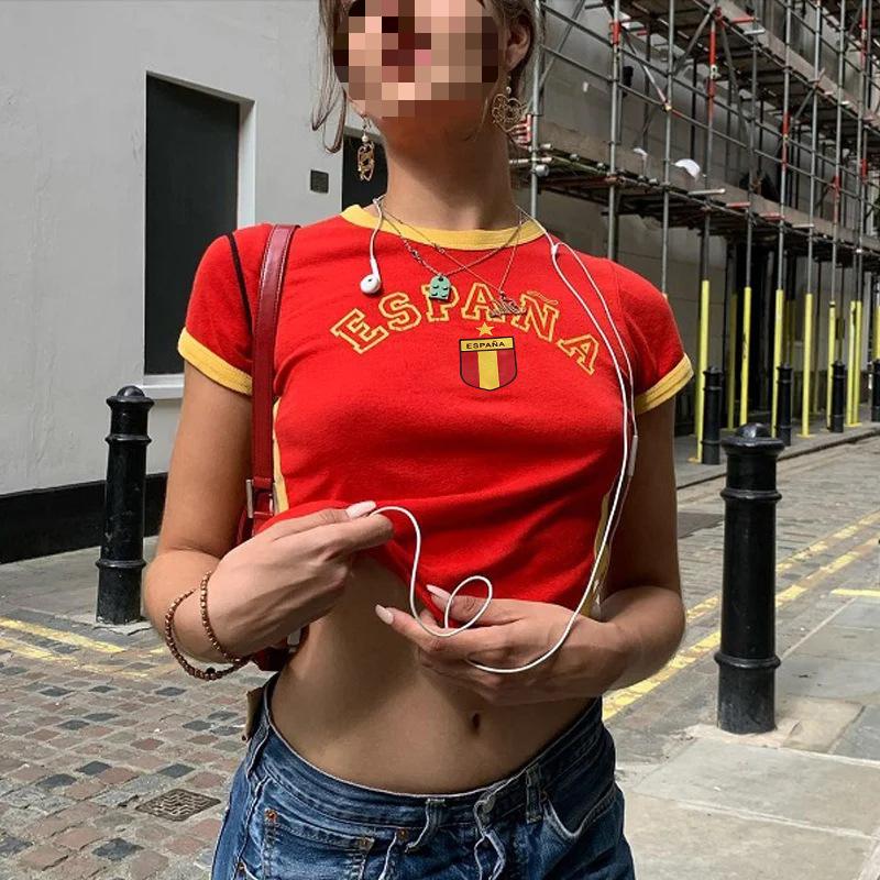 Летняя футболка в европейском и американском стиле с круглым вырезом и принтом в виде букв, короткая, облегающая