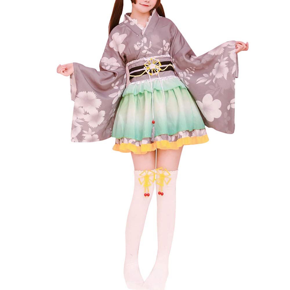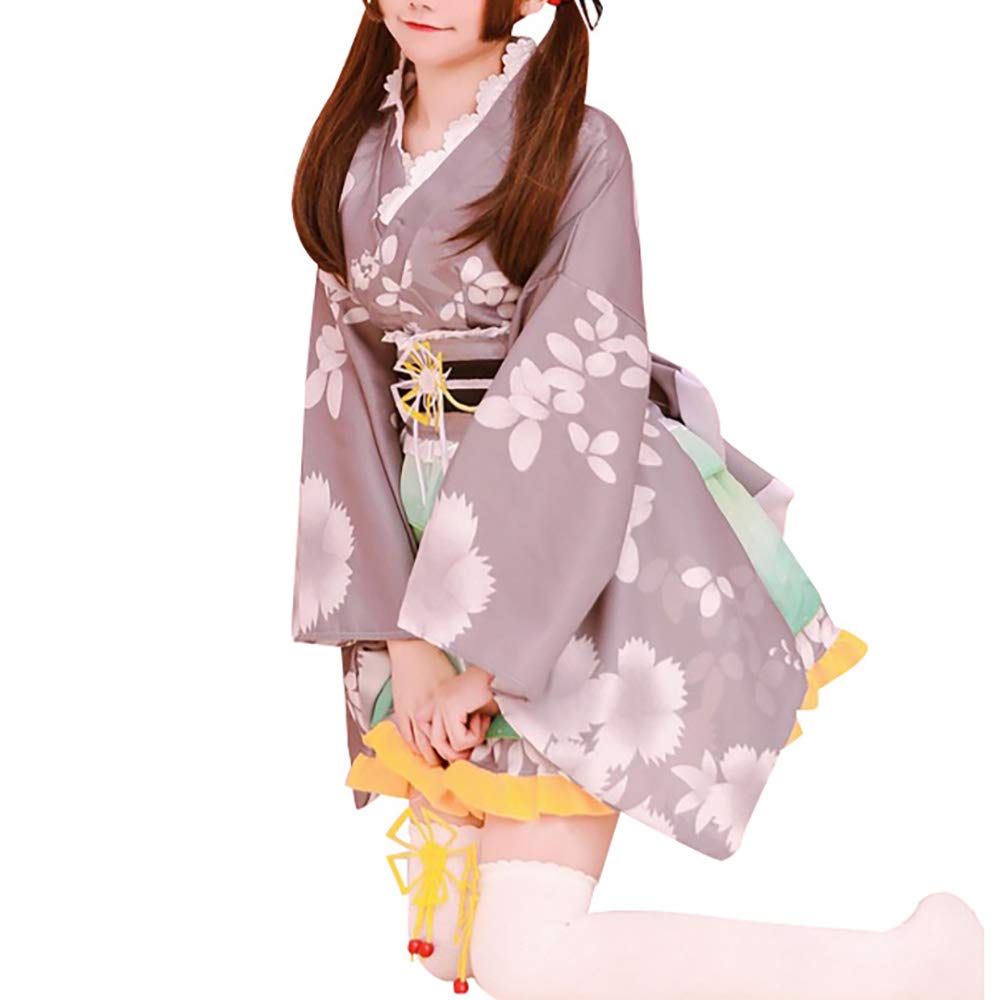 HONGFU Куртизанка Длинное Кимоно Платье Шифон Вишня Цветок Японский Стиль Юката Костюм Косплей Костюм с Оби Порошок Женский (Серый)