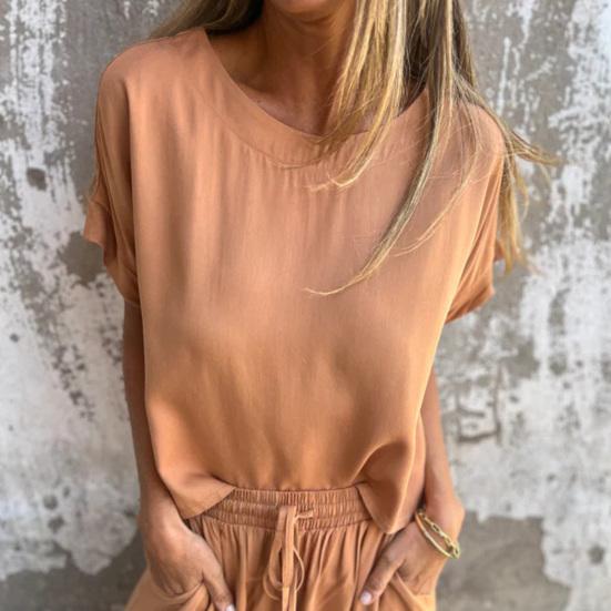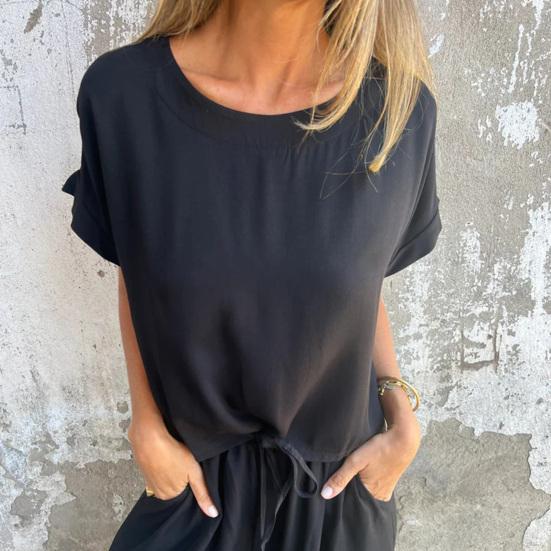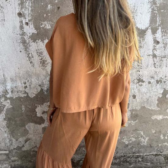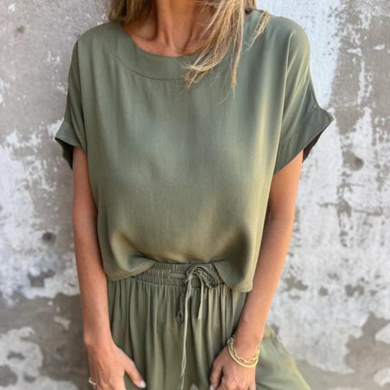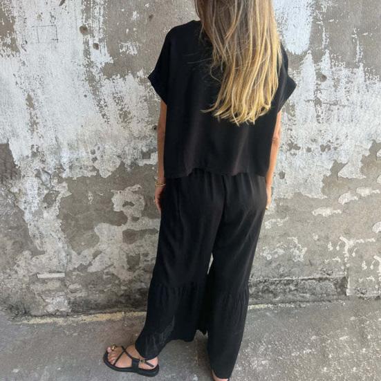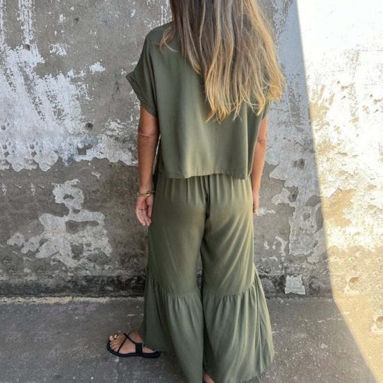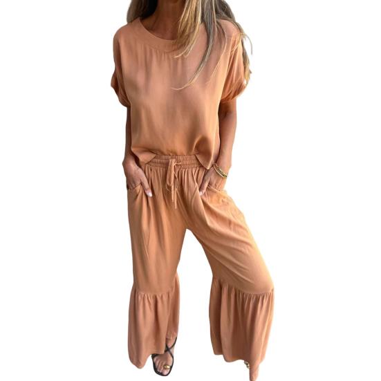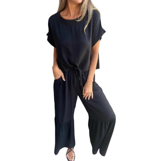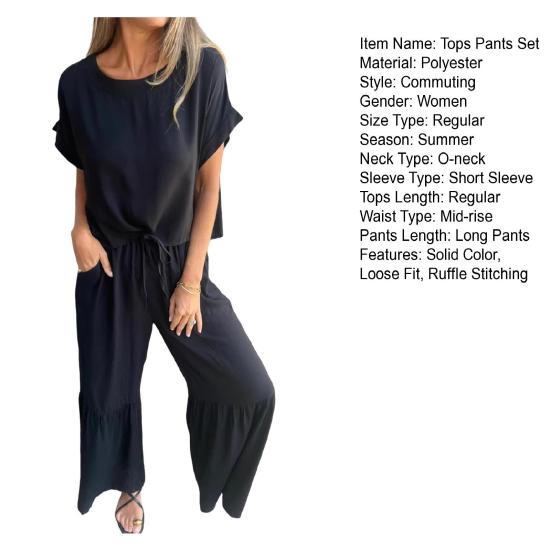 Yousheng 2 шт./компл. Женский повседневный наряд Футболки-пуловеры с коротким рукавом и круглым вырезом Эластичная талия Регулируемый шнурок Манжеты с оборками Отделка строчкой Брючный комплект Однотонный
